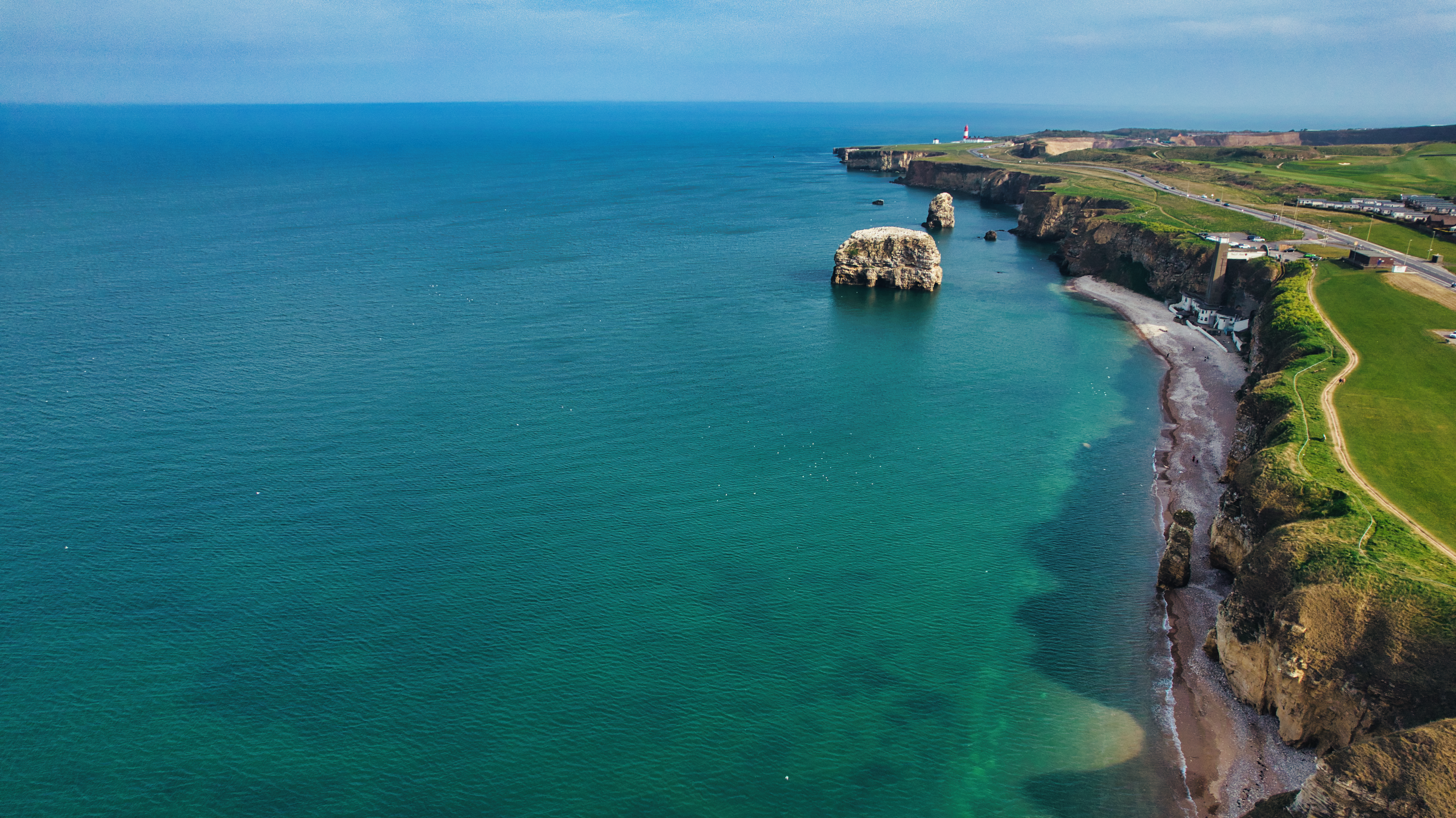 Aerial view of coastal scene with turquoise sea, cliffs, beach, and rock formations, under a blue sky at Marsden Beach, UK.