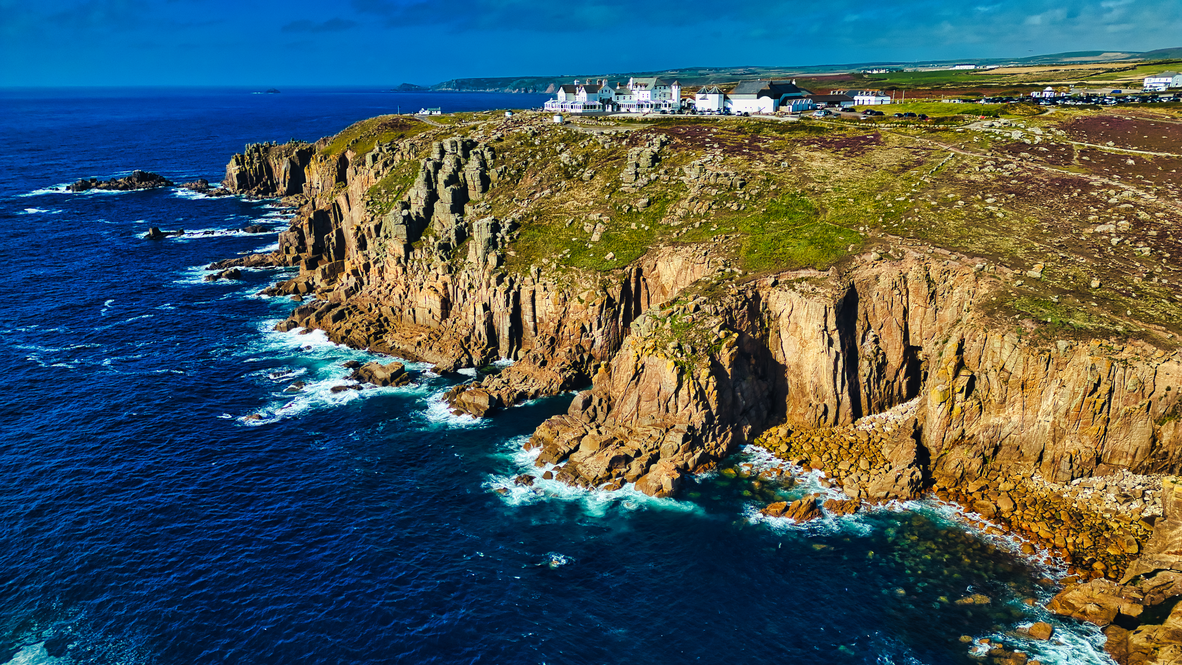 A stunning coastal view featuring rugged cliffs meeting the deep blue ocean. The landscape is dotted with green vegetation and a few white buildings perched on the cliffs, under a clear blue sky. Waves crash against the rocky shore, creating a picturesque scene.