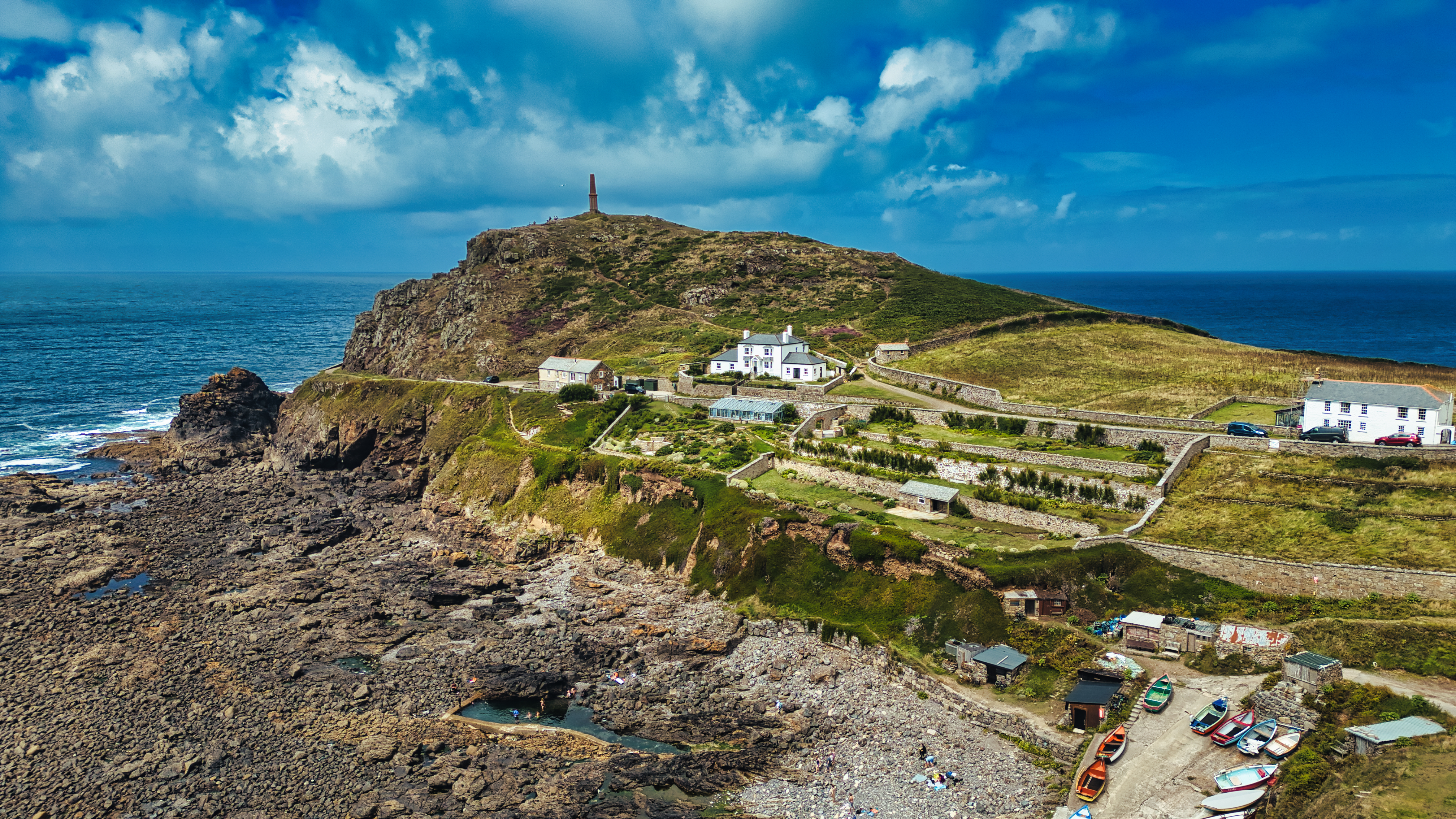 Aerial view of a coastal landscape featuring a rocky shore, a lighthouse on a hill, and a cluster of white buildings. The scene includes boats on the beach and lush greenery, with dramatic clouds in the blue sky above.