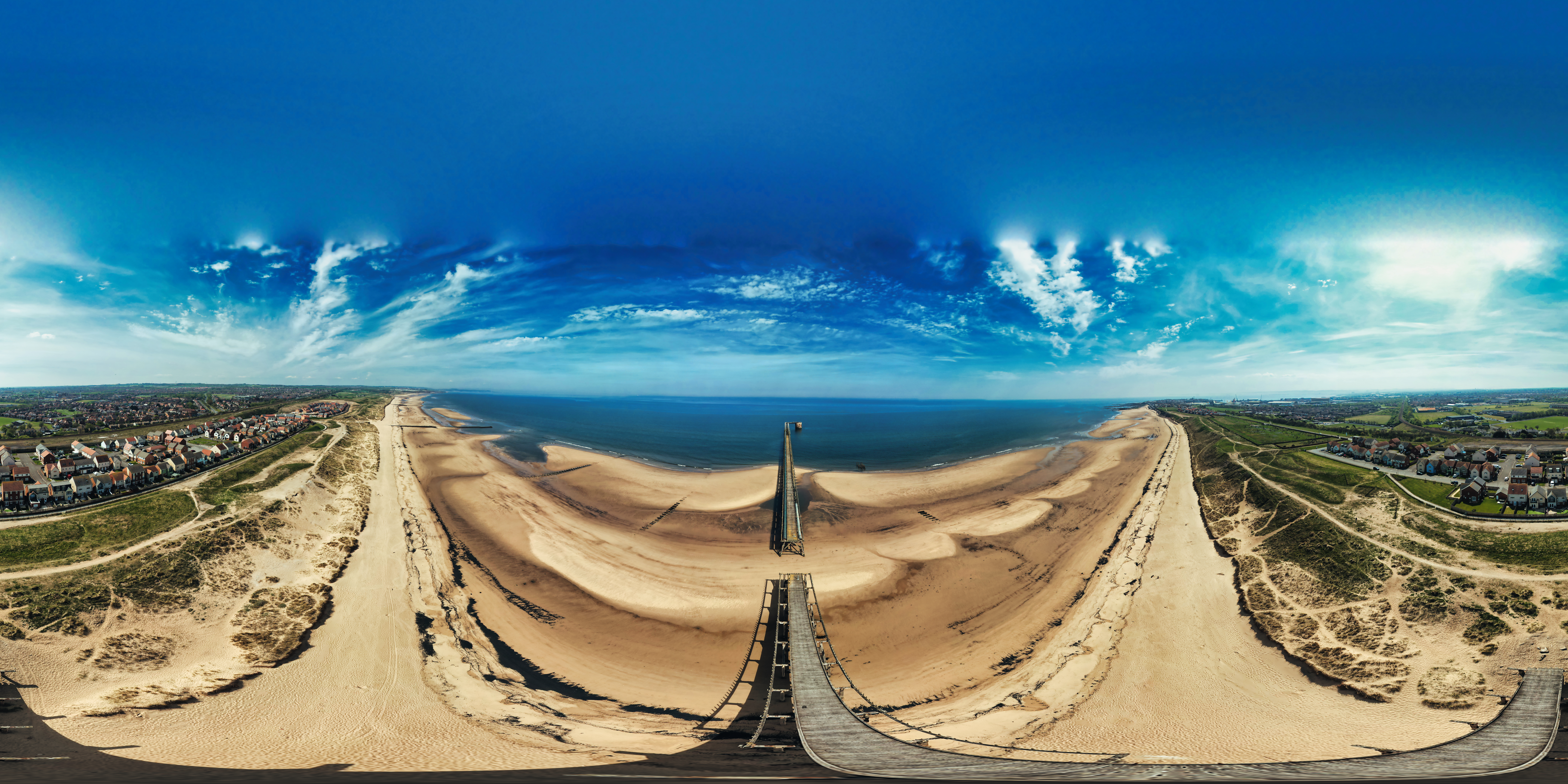 Panoramic view of a beach and coastline under a blue sky with some clouds; a pier extends into the ocean at Steetley Pier, UK.