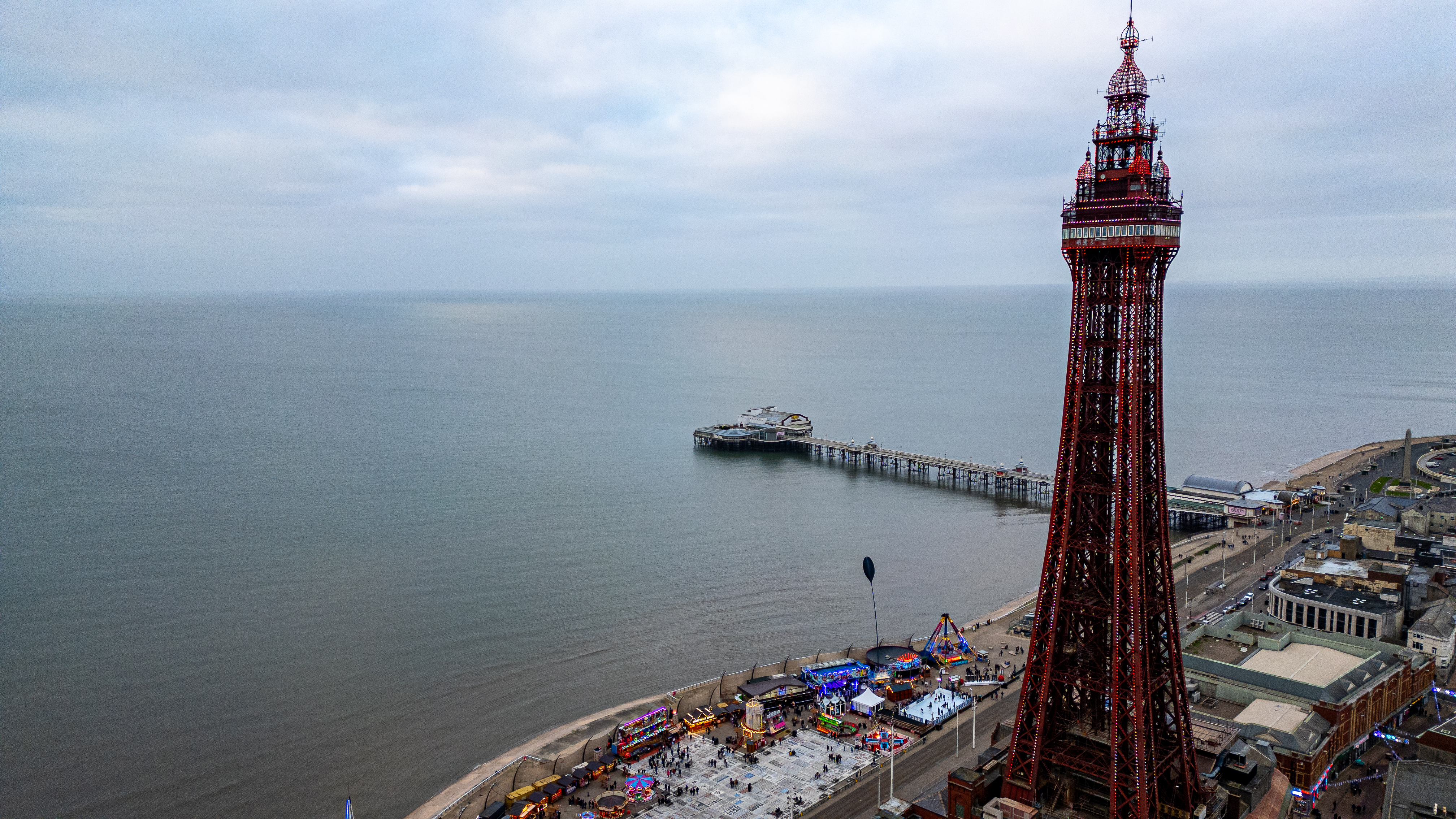 An aerial view of a coastal town featuring a tall red lattice tower, a pier extending into the sea, and a lively amusement area on the promenade in Blackpool.