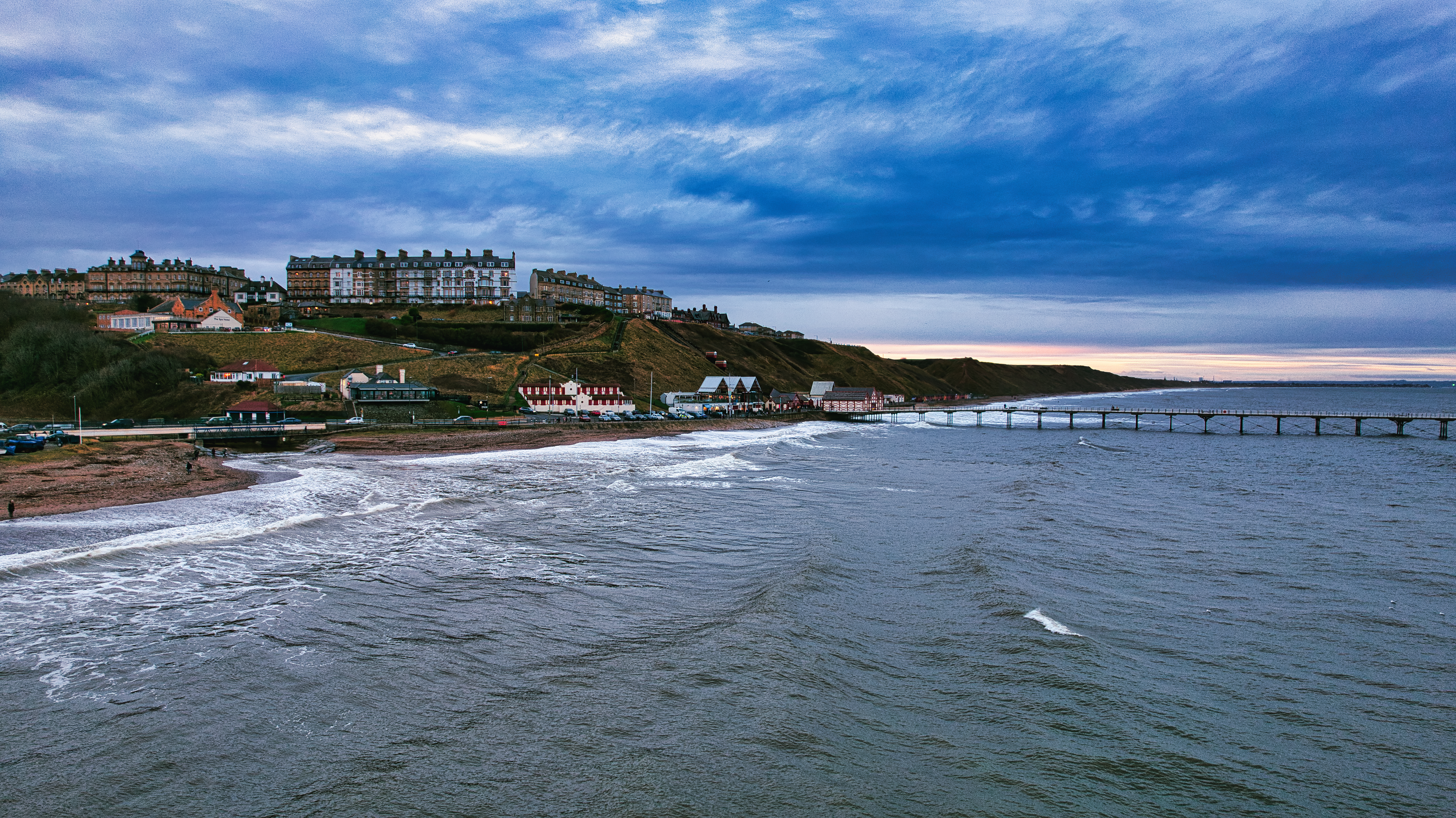 Coastal town skyline with multi-story buildings on a cliff overlooking a beach, ocean waves, and a long pier extending into the sea under a partly cloudy sky in Saltburn by the Sea