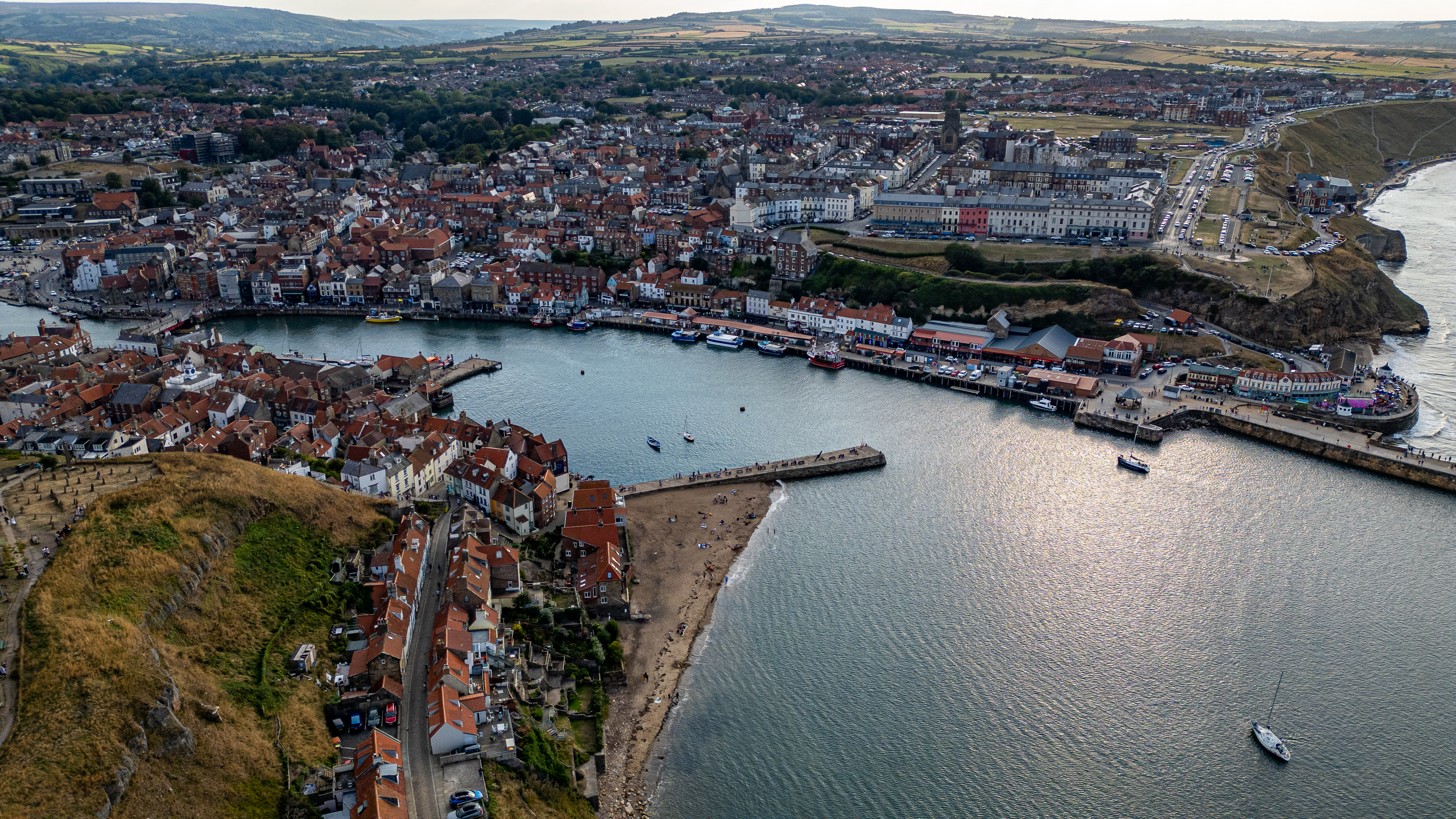 Aerial view of a coastal town featuring a harbor with boats, buildings with red tile roofs, a beach, and a promenade in Whitby, UK.