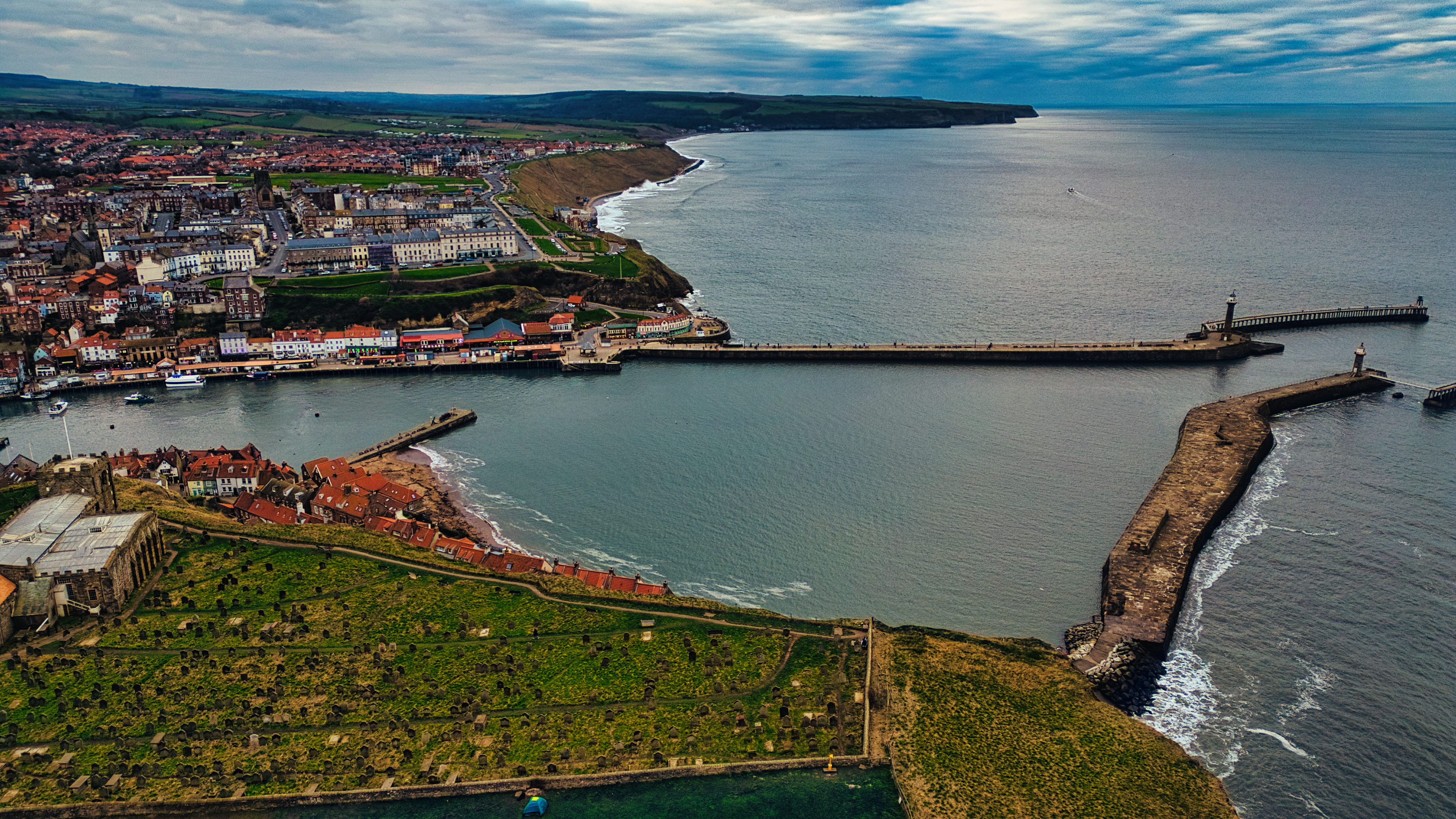 Aerial view of coastal town with harbor, piers, church, and green fields. Cloudy sky over blue water in Whitby, UK.