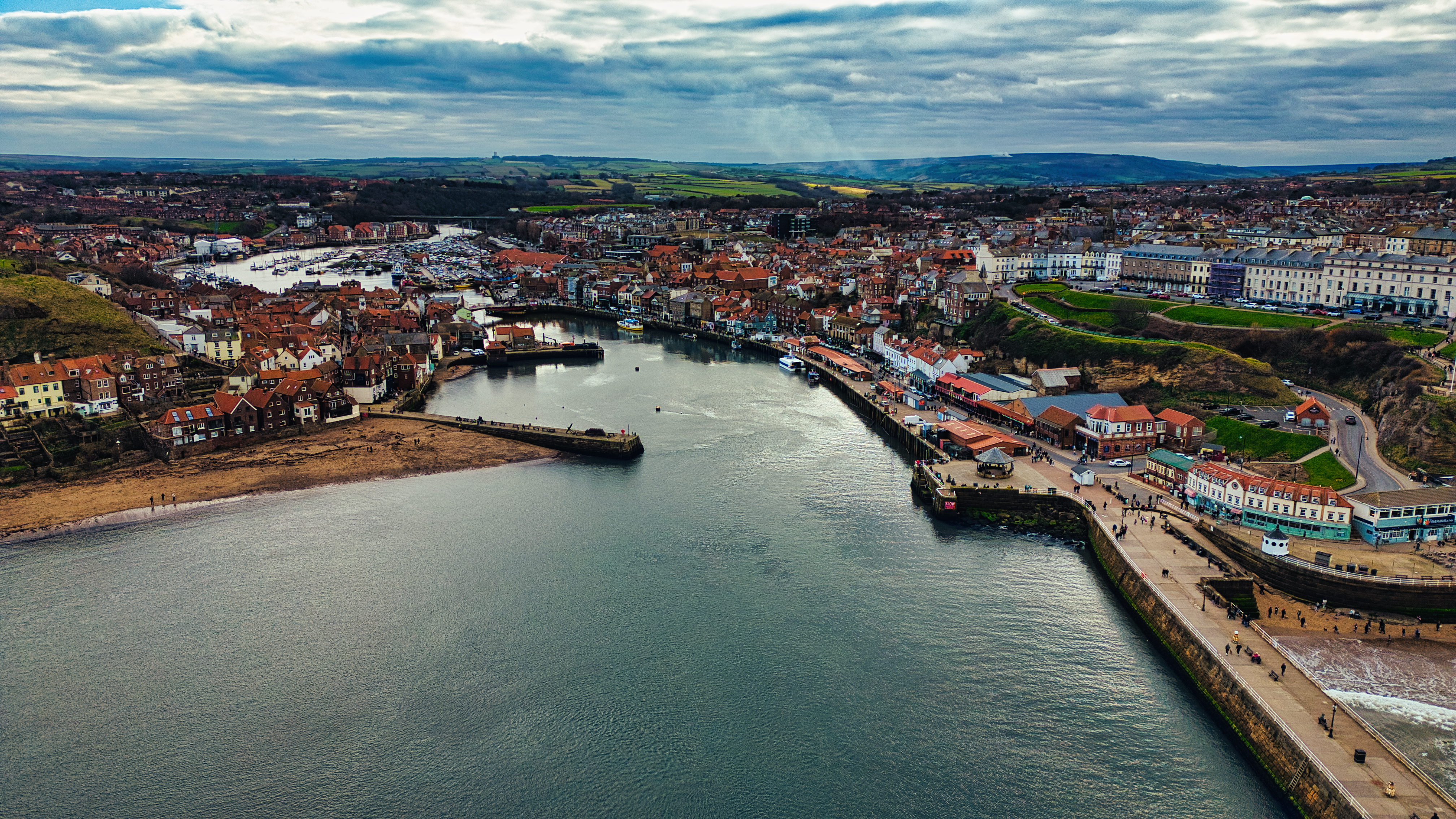Aerial view of a coastal town featuring a harbor, beach, and surrounding landscape under a cloudy sky in Whitby, UK.