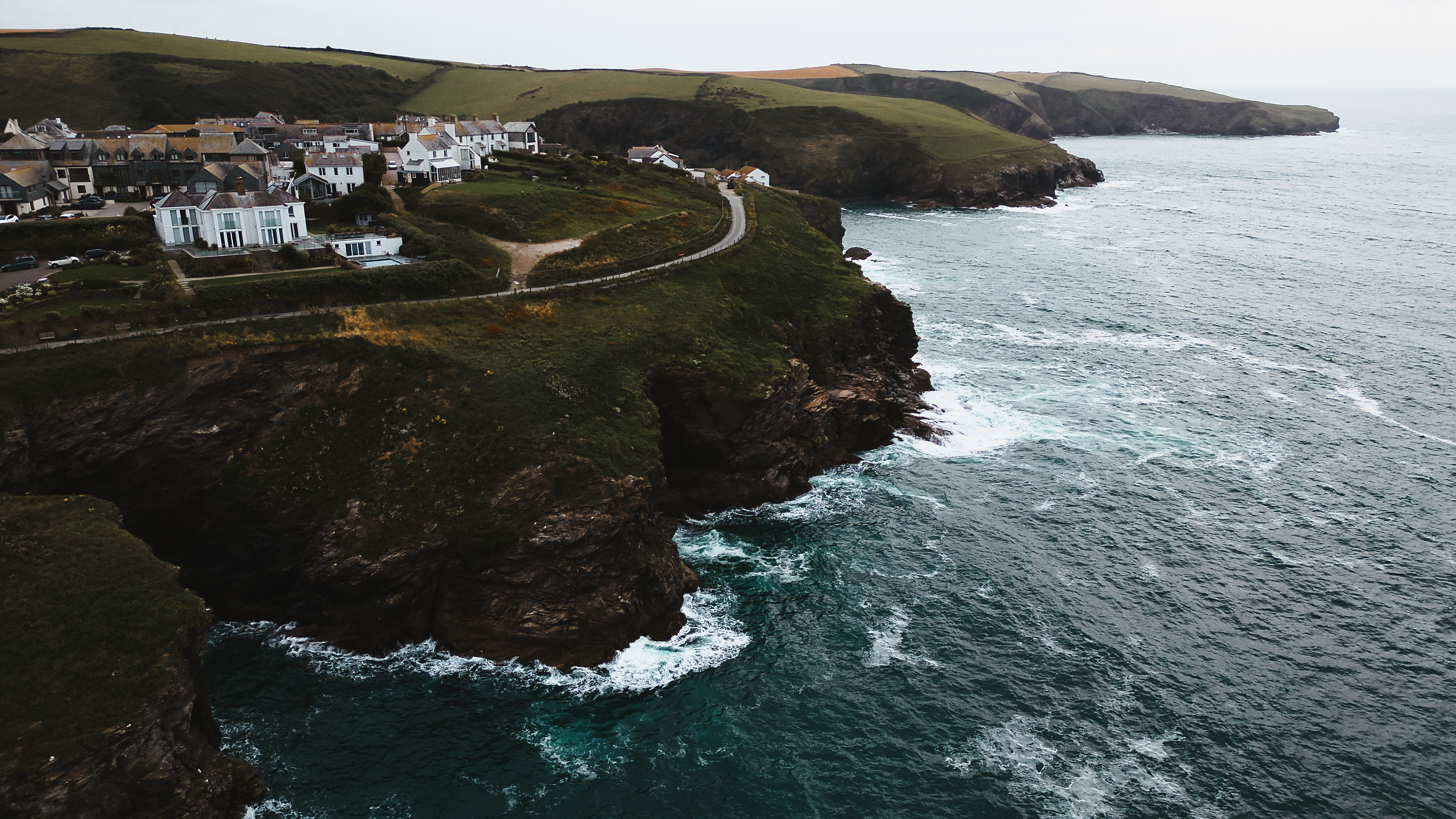 A scenic coastal view featuring a small village perched on a cliff overlooking the ocean. The waves crash against the rocky shore, with lush green hills in the background under a cloudy sky.