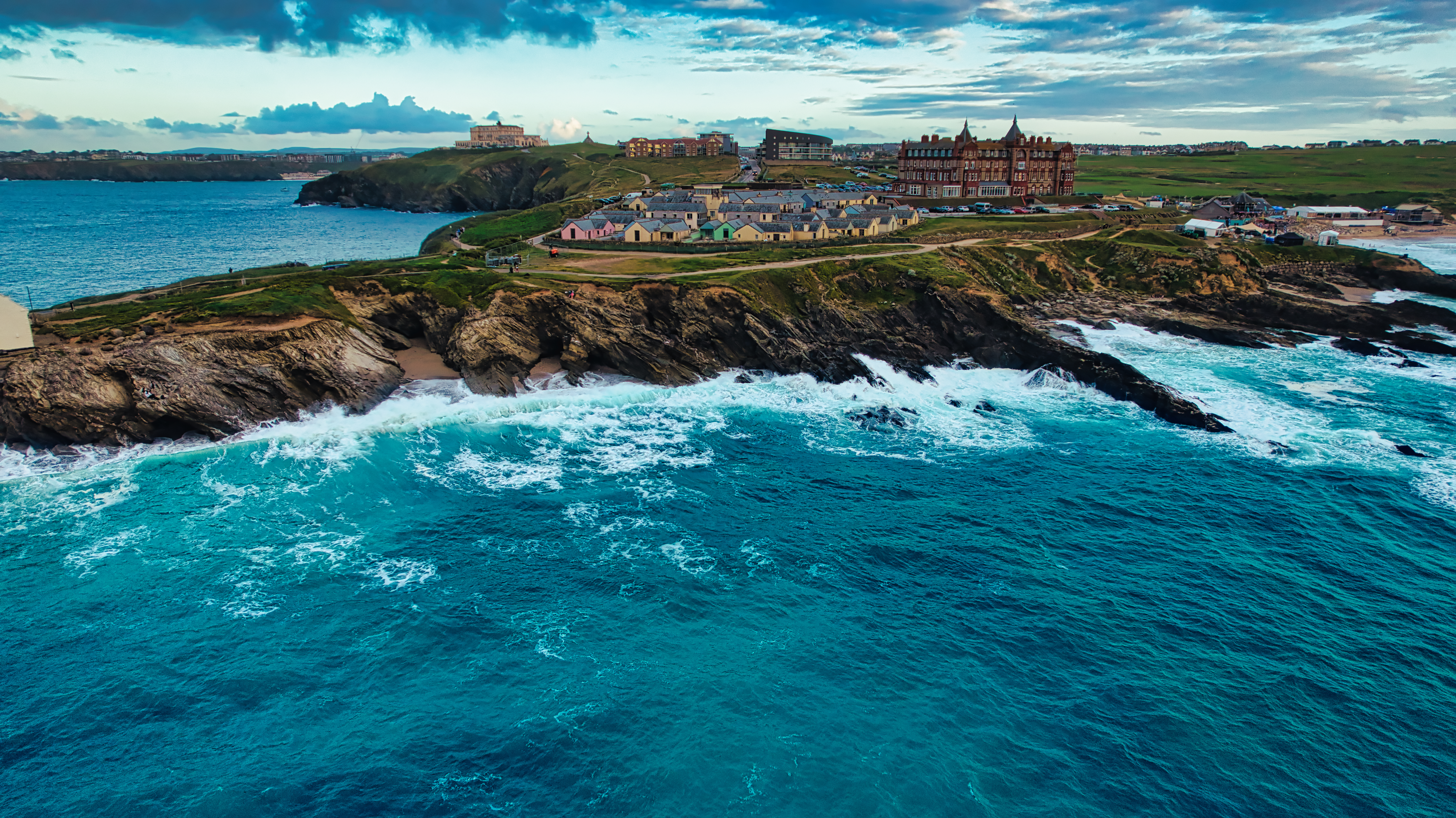 A scenic coastal view featuring rocky cliffs and a vibrant blue ocean. In the background, a charming village with colorful houses is nestled against the hillside, while a grand hotel stands prominently. The sky is partly cloudy, adding to the picturesque landscape.