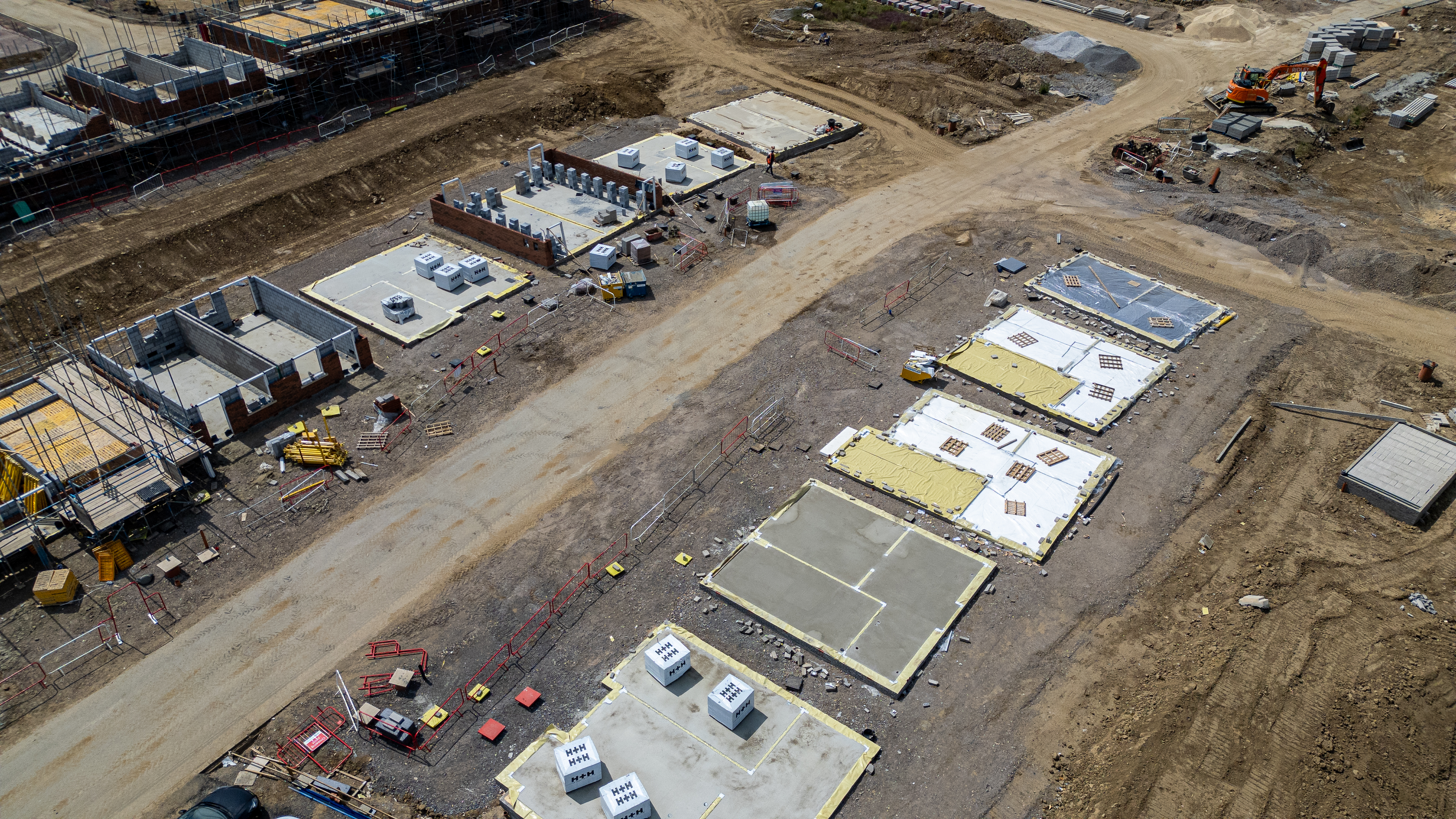 An aerial view of a construction site shows unfinished building foundations, scaffolding, and heavy equipment scattered across the dry, uneven terrain at Millers Home in Catterick, UK.