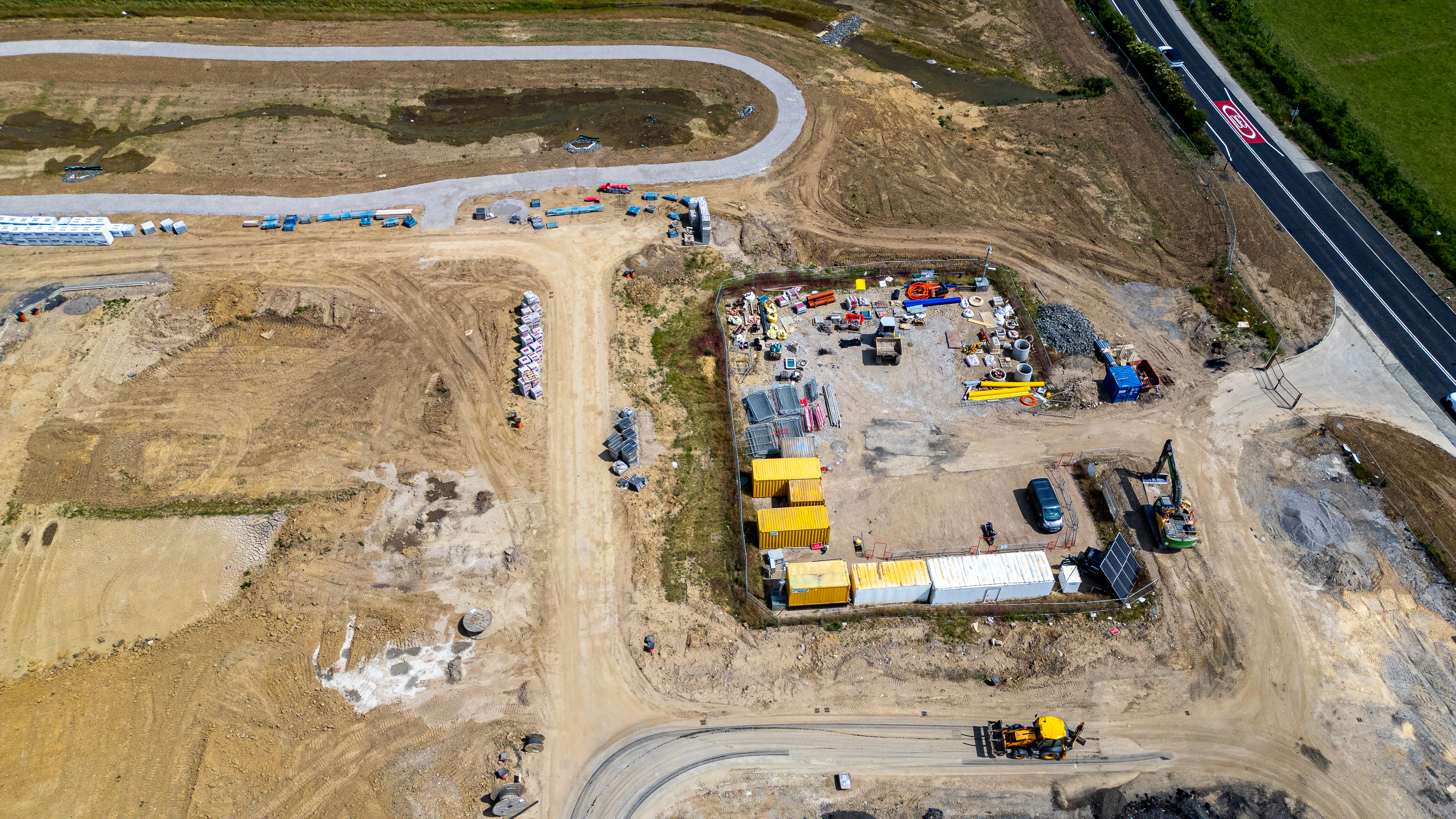 Aerial view of a construction site with various equipment, materials, shipping containers, and unfinished roads at Miller Homes in Catterick, UK.