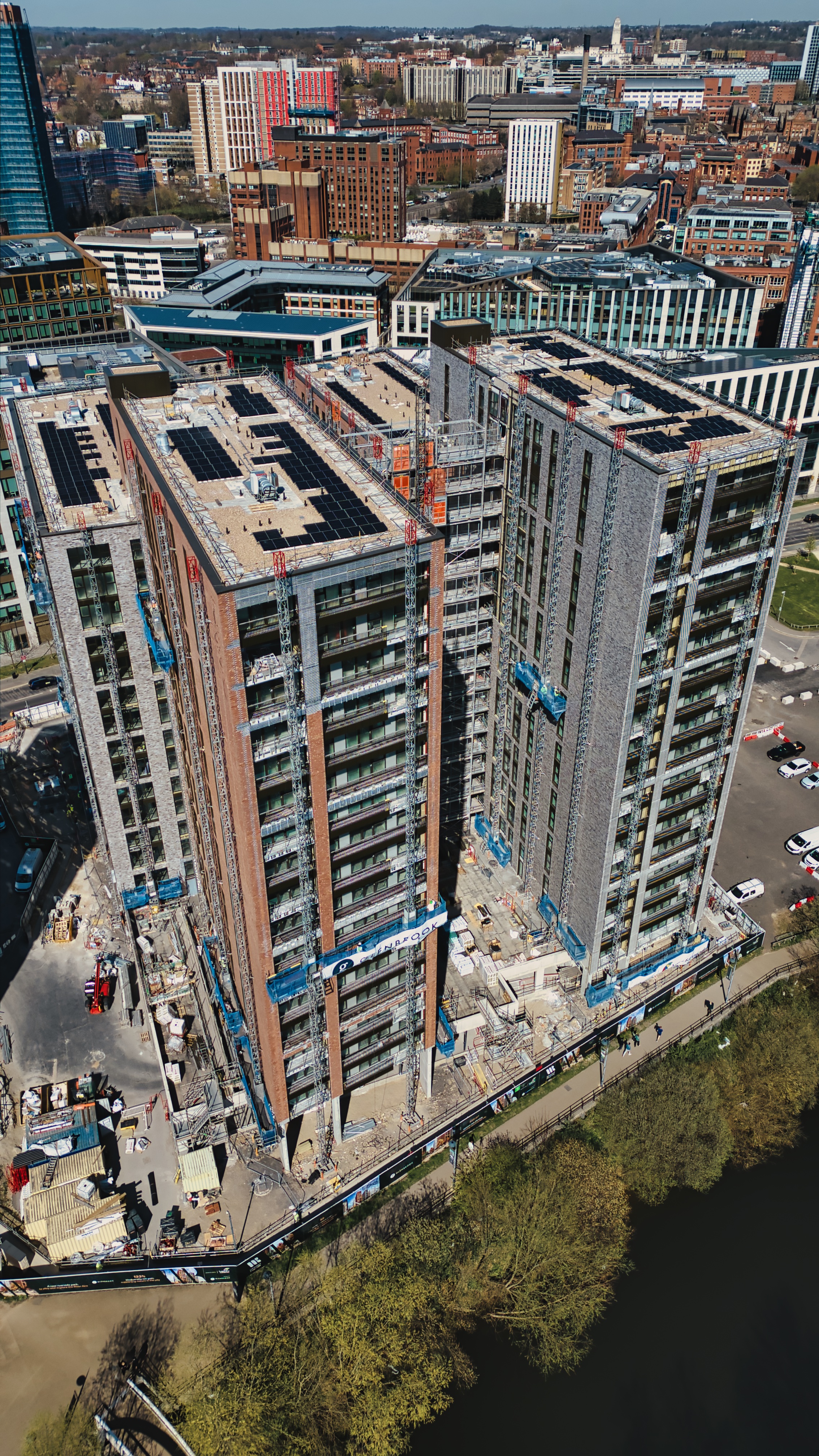 Aerial view of three tall buildings under construction in an urban area, featuring solar panels, cranes, and surrounding cityscape in Leeds, UK.