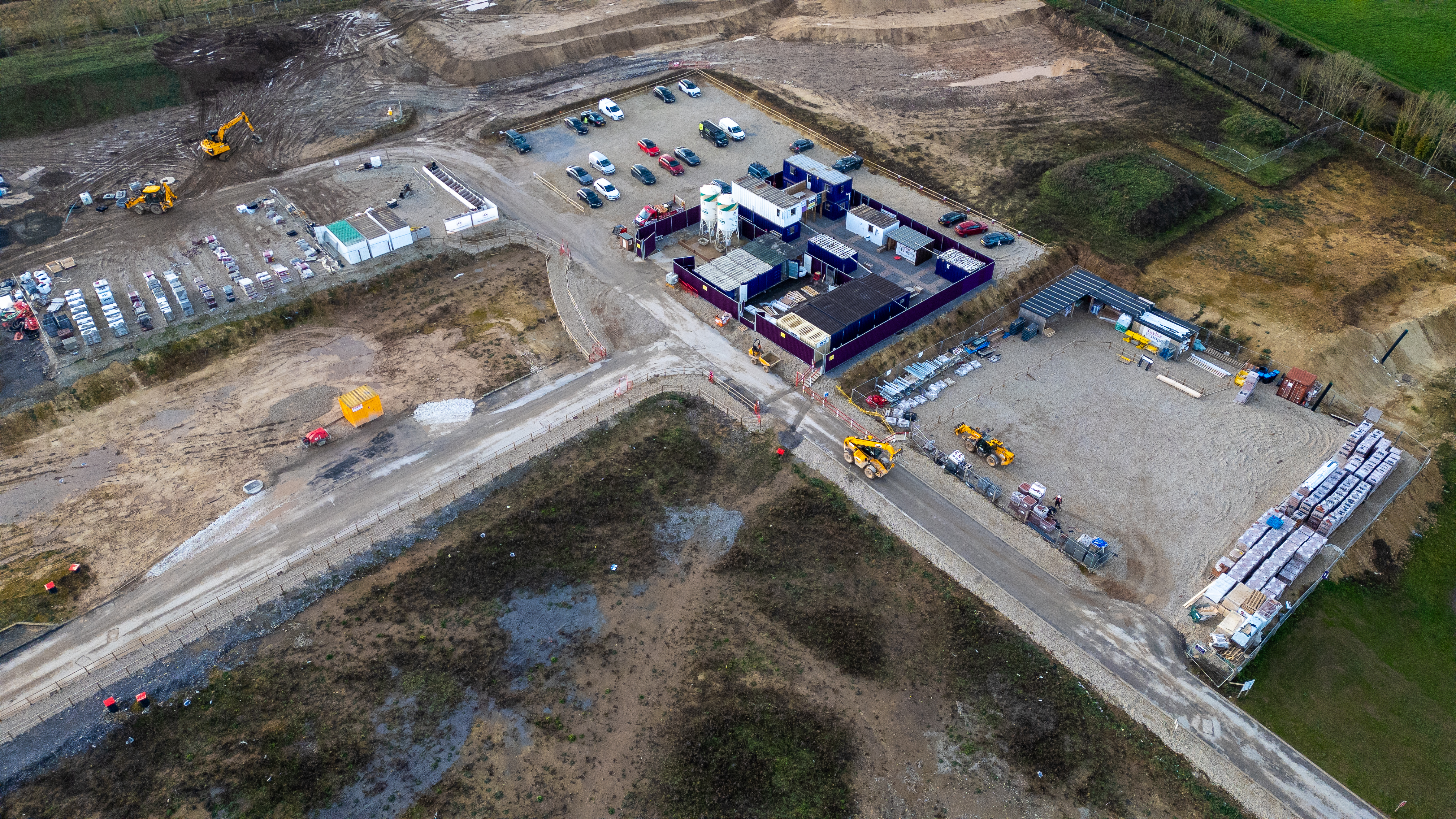 Aerial view of a construction site with heavy machinery, vehicles, buildings, and stacked materials at Taylor Wimpey, Ripon.