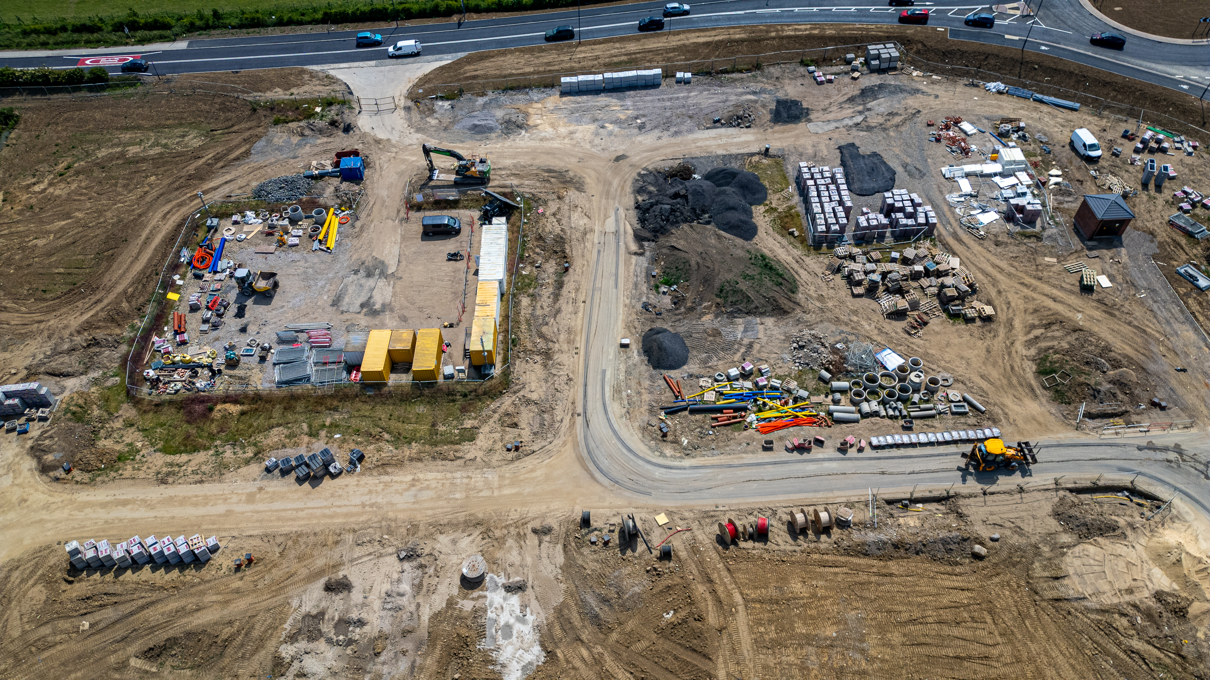 An aerial view of a construction site with heavy machinery, building materials, and temporary structures, adjacent to a highway with passing vehicles at Miller Homes in Catterick, UK.