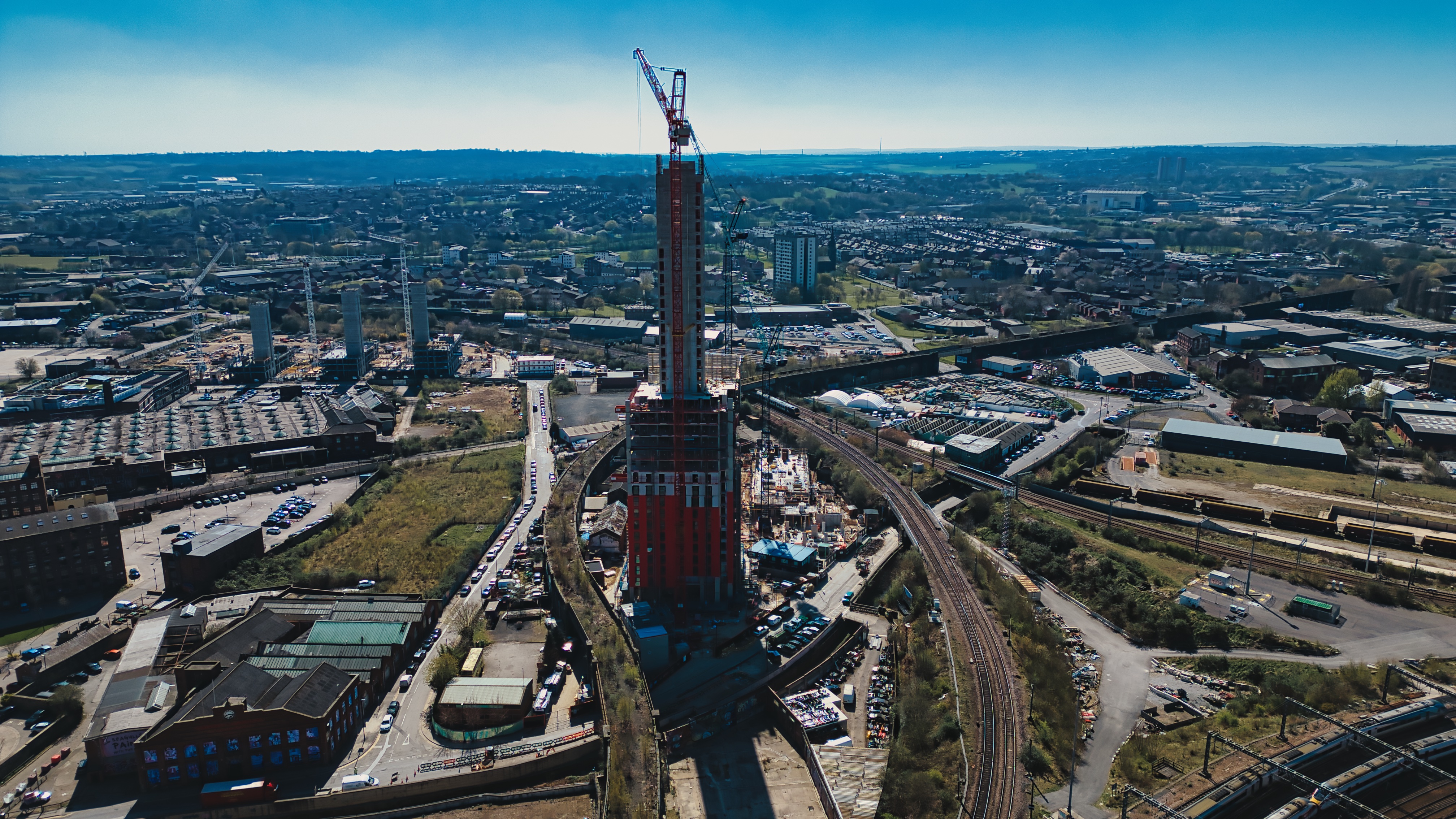 Aerial view of a tall skyscraper under construction, surrounded by railway lines and urban landscape, under a bright blue sky in Leeds, UK.