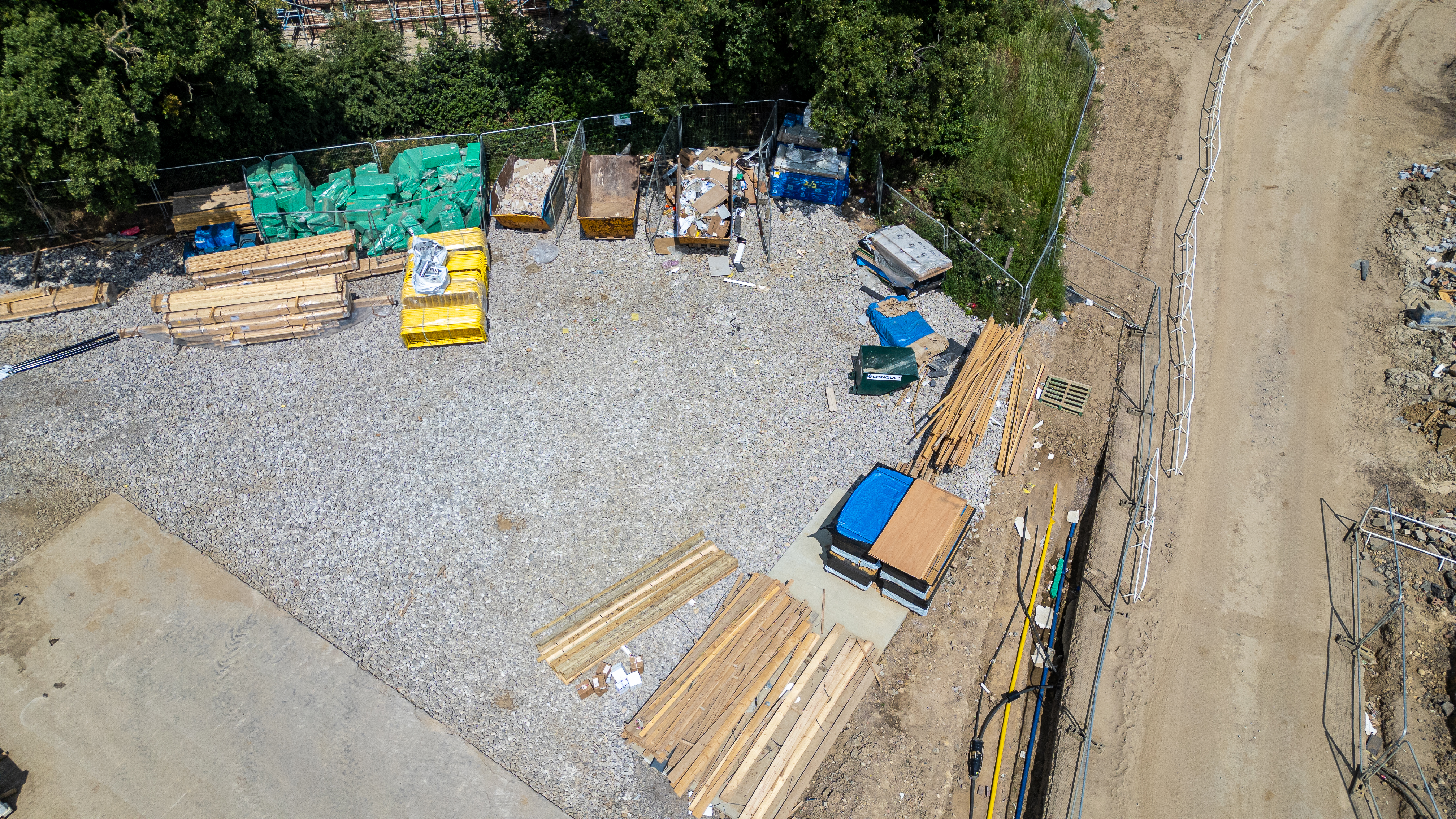An aerial view shows a construction site with sorted materials, including lumber, debris bins, and fencing, on a gravel and dirt ground at Miller Homes in Catterick, UK.