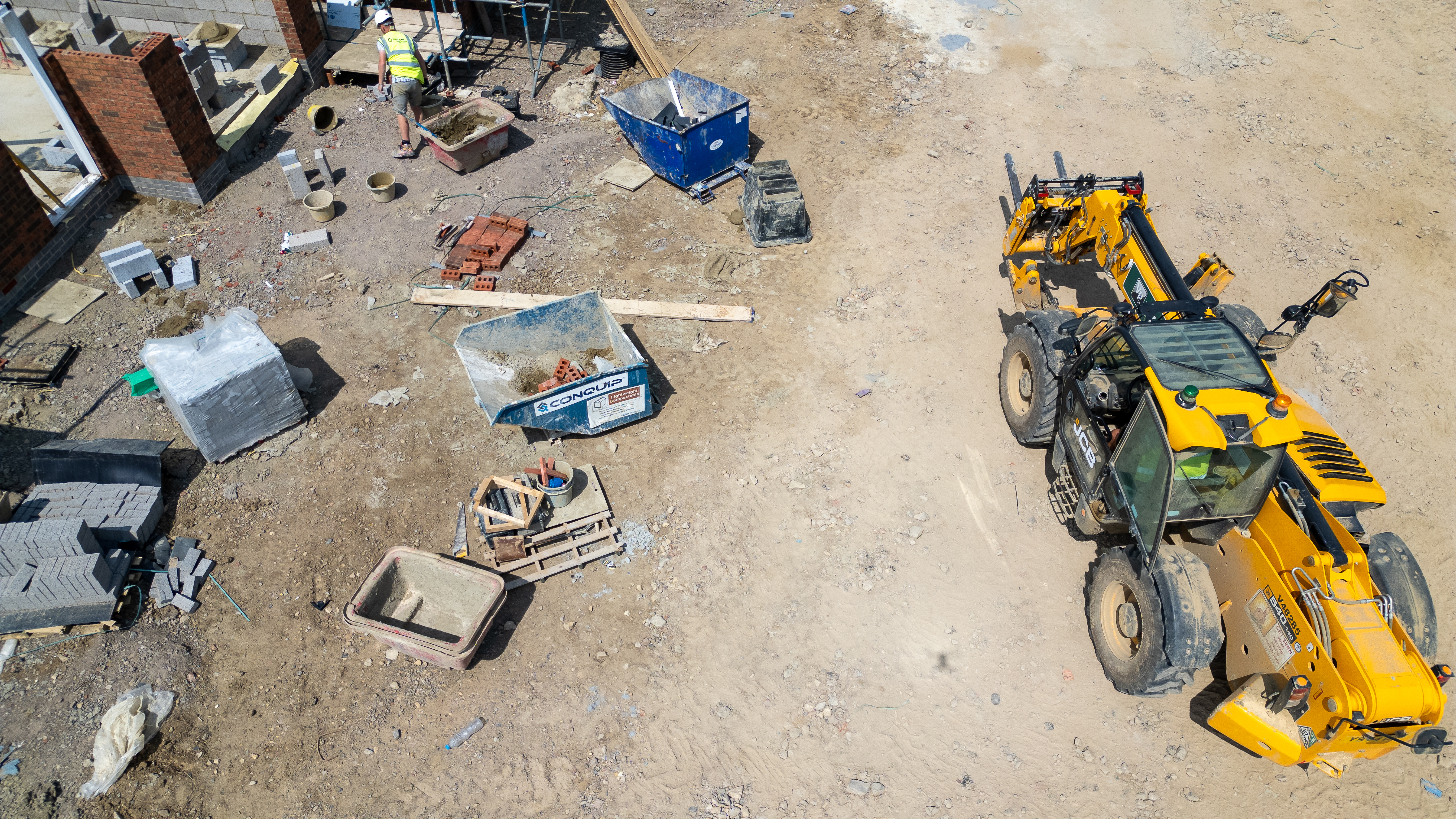 An aerial view of a construction site showing a telehandler, stacks of bricks and blocks, wheelbarrows, and a worker at Miller Homes in Catterick, UK.