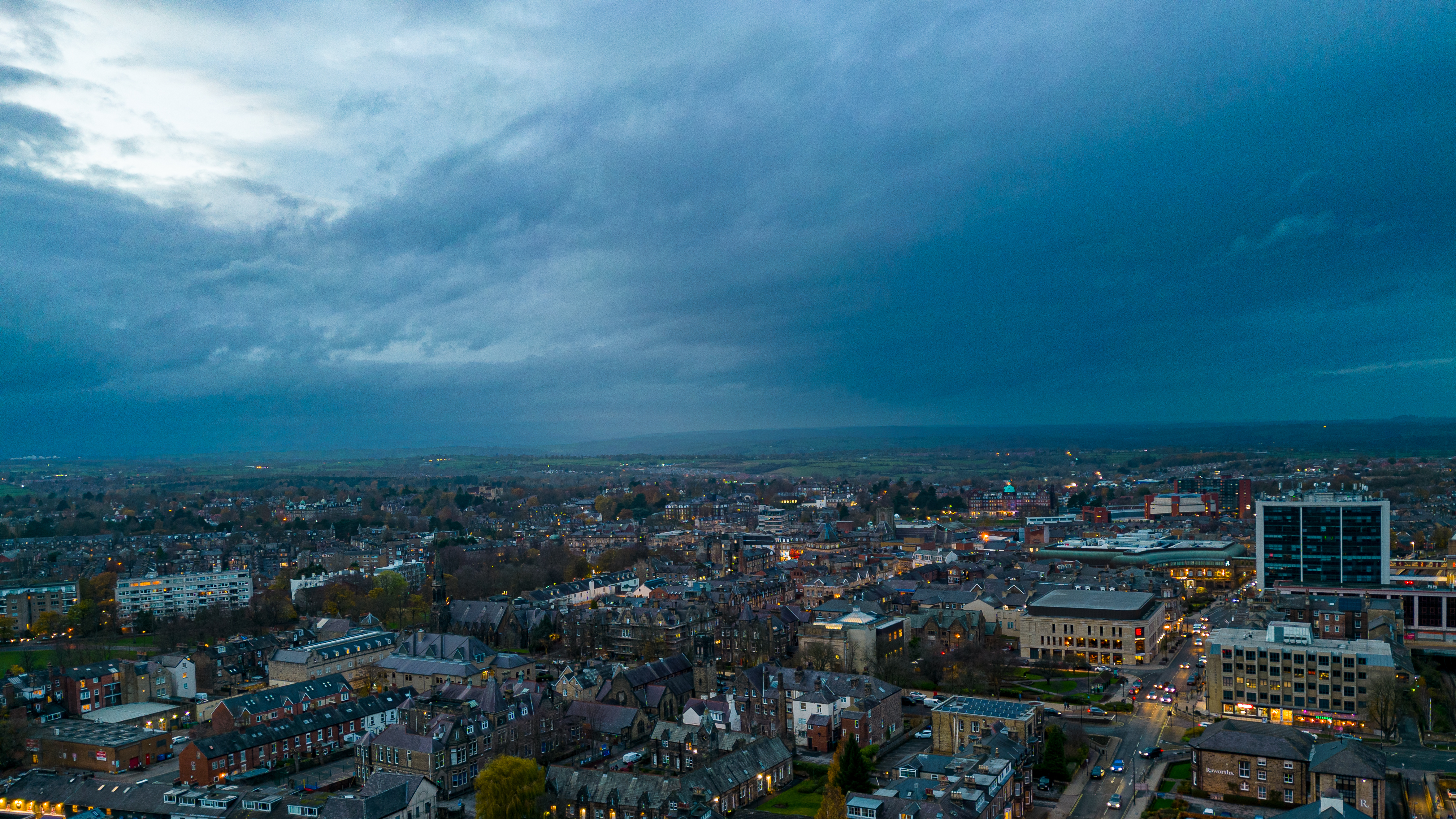 Dramatic cityscape under stormy skies at dusk, with dark clouds looming over urban buildings in Harrogate, North Yorkshire.