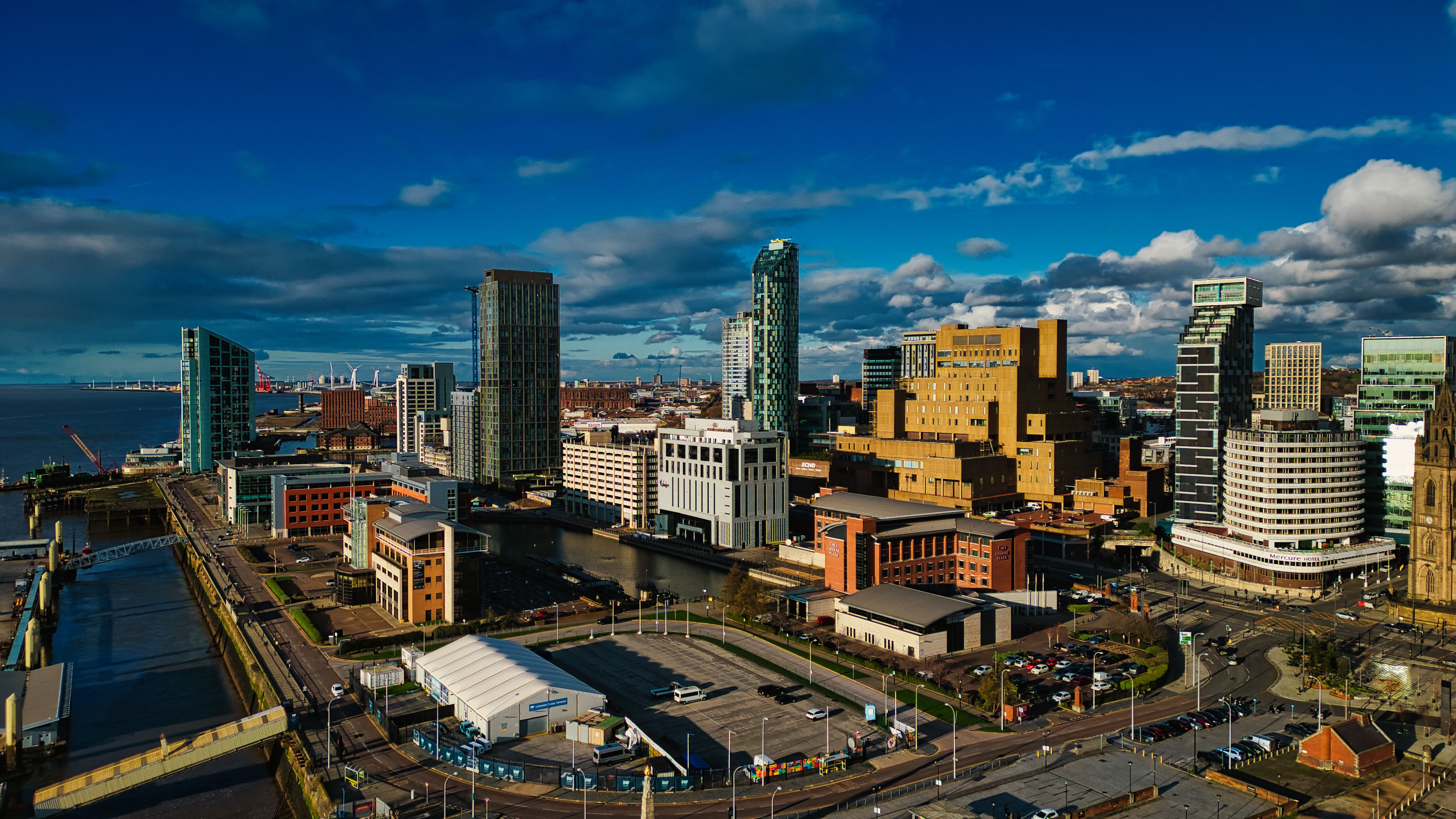 Dramatic cityscape with modern skyscrapers under a dynamic sky in Liverpool, UK.