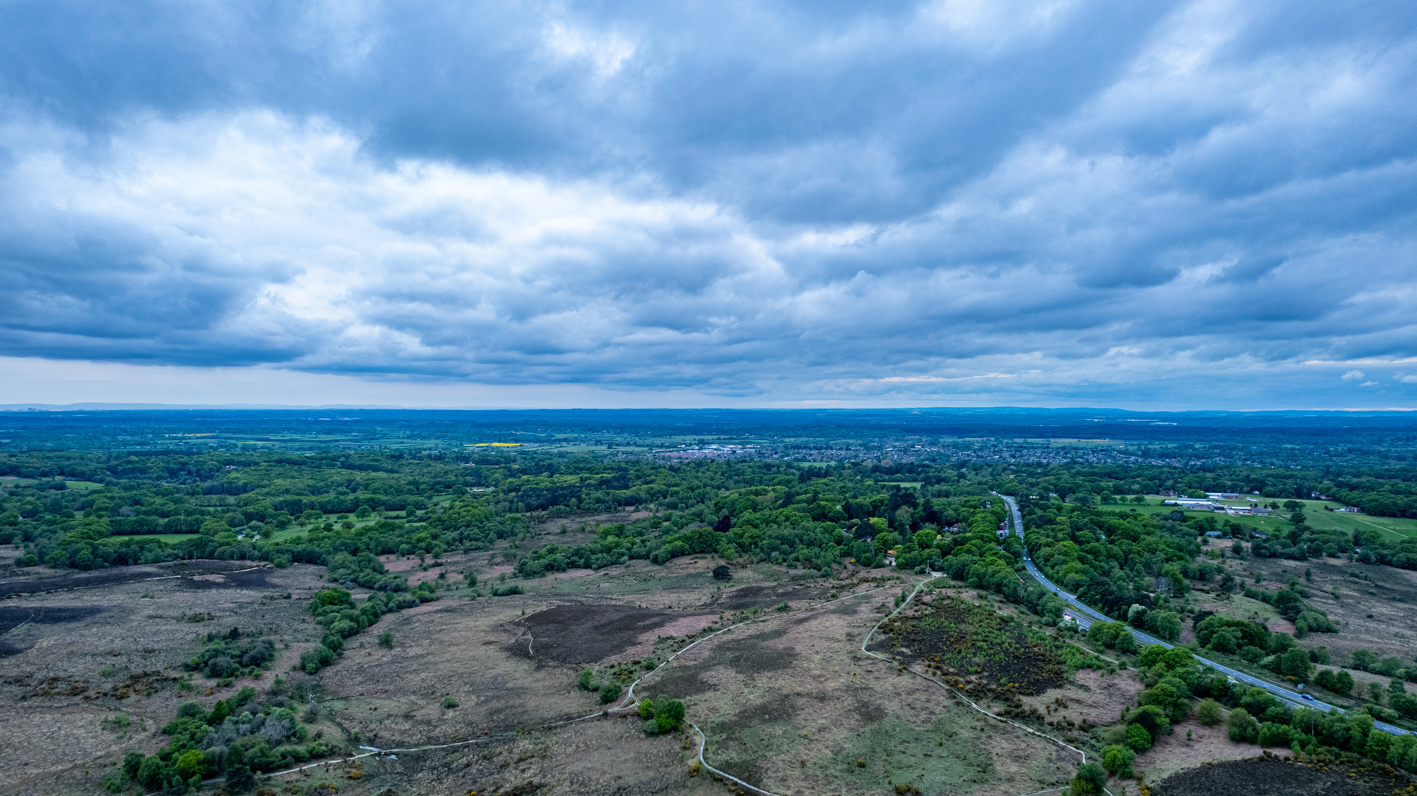 Dramatic cloudscape over a lush landscape with a winding road, showcasing nature's vastness and tranquility.