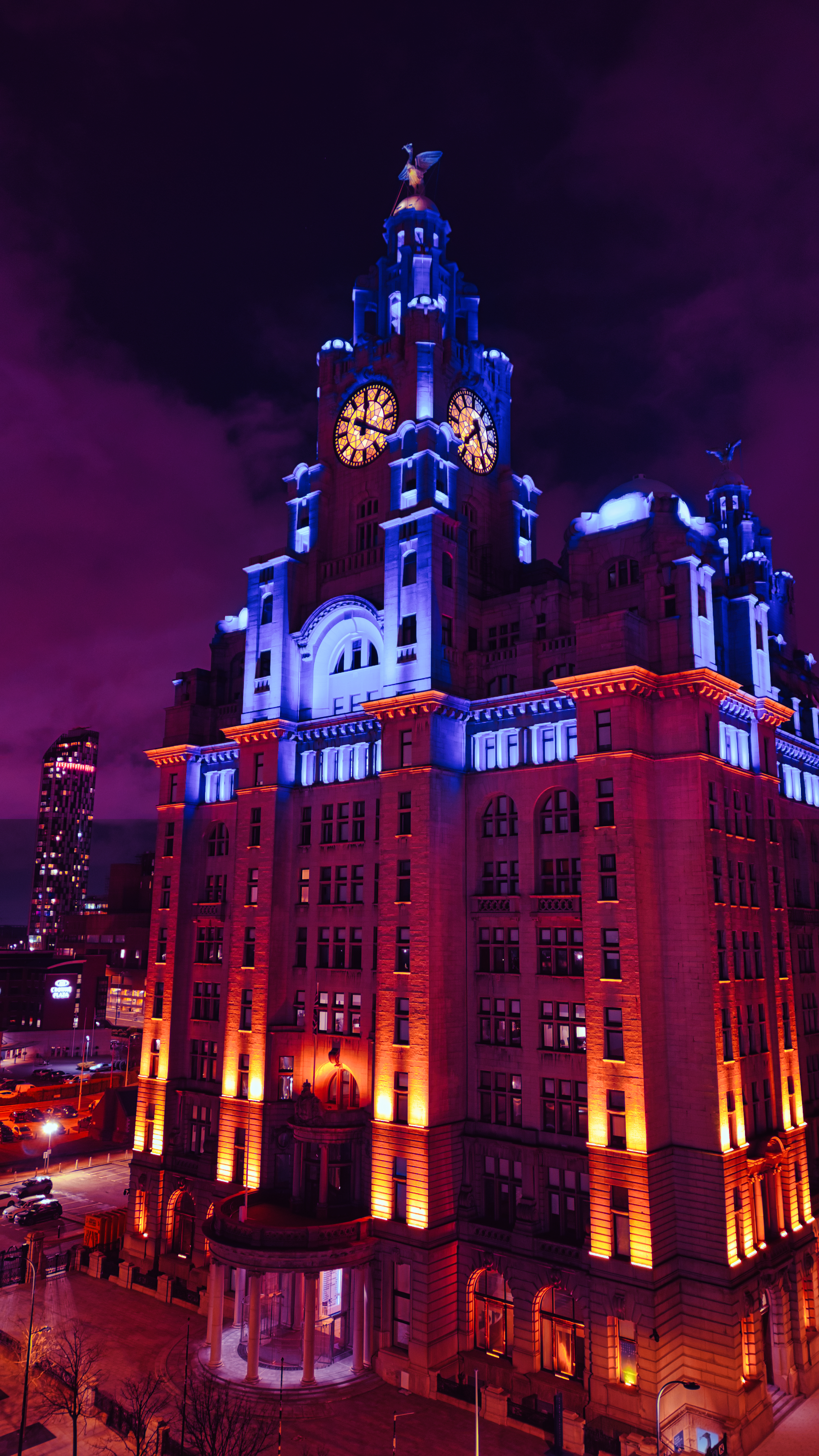 Dramatic night view of an illuminated historic building with clock tower against a twilight sky in Liverpool, UK.