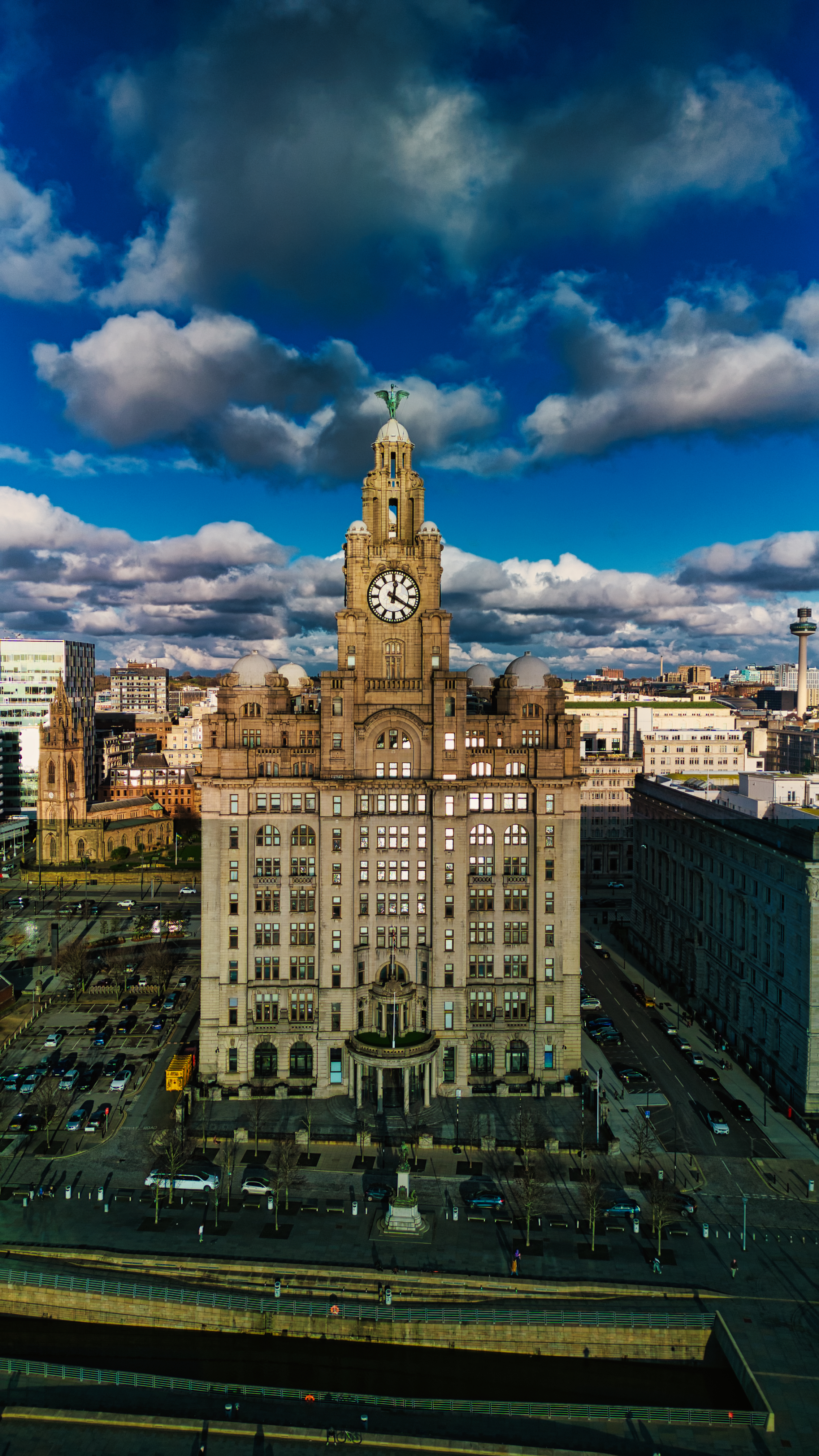 Dramatic sky over historic clock tower building in urban landscape in Liverpool, UK.