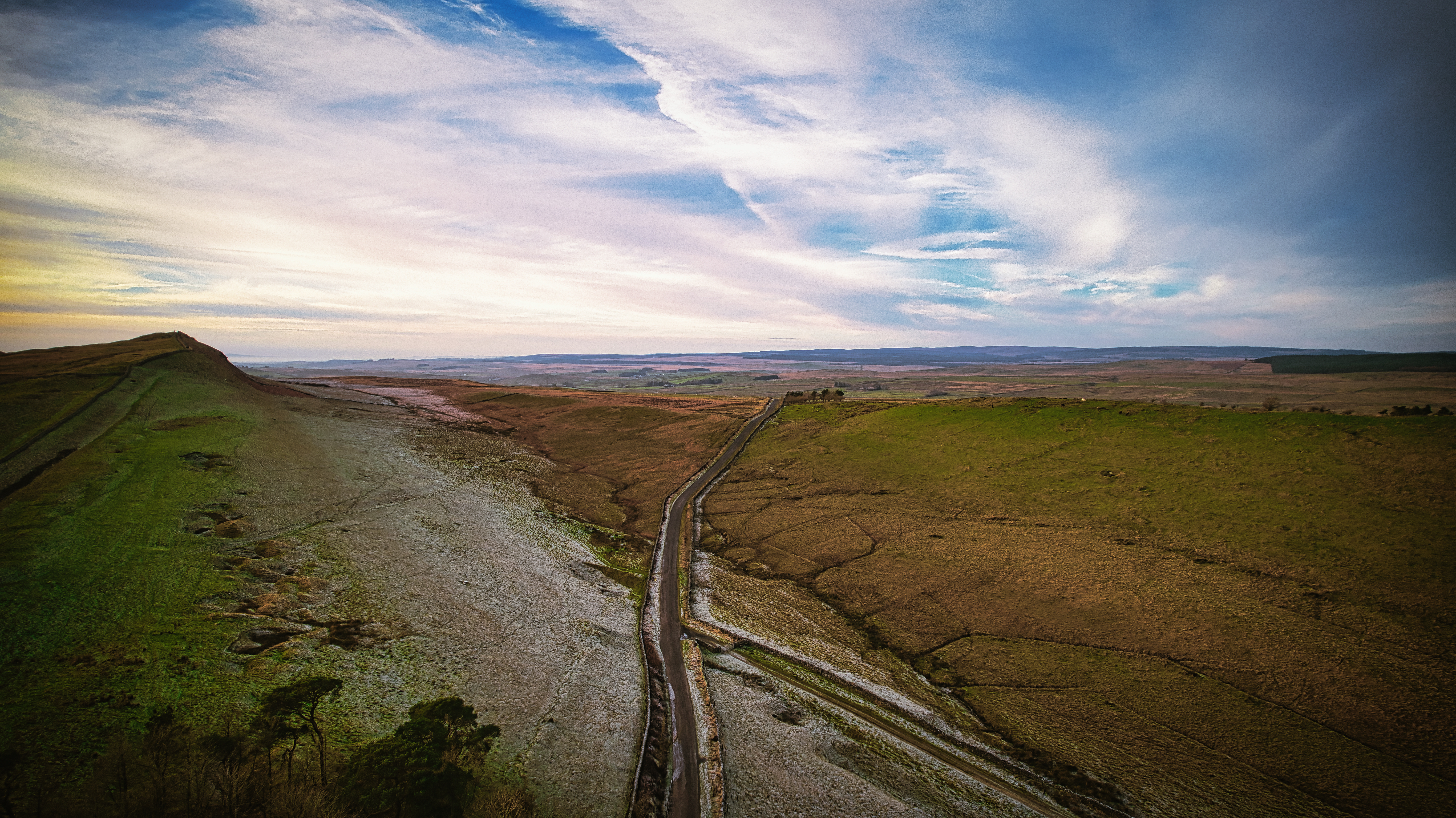 Empty country road amidst rolling hills under a dramatic sky at dusk at Sycamore Gap, Northumberland, UK.