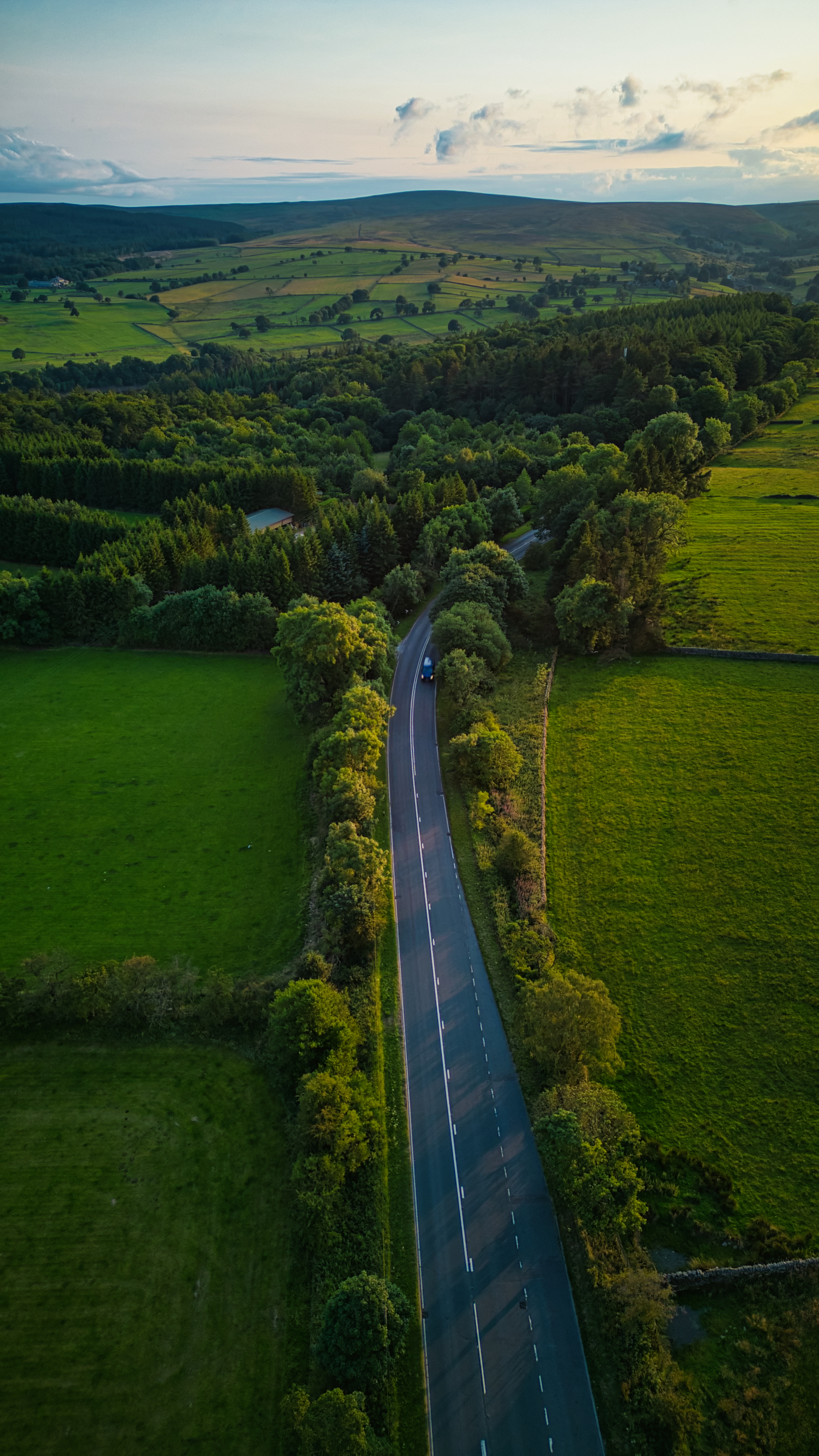Empty country road meandering through lush green fields with forested hills in the background during sunset in Yorkshire.