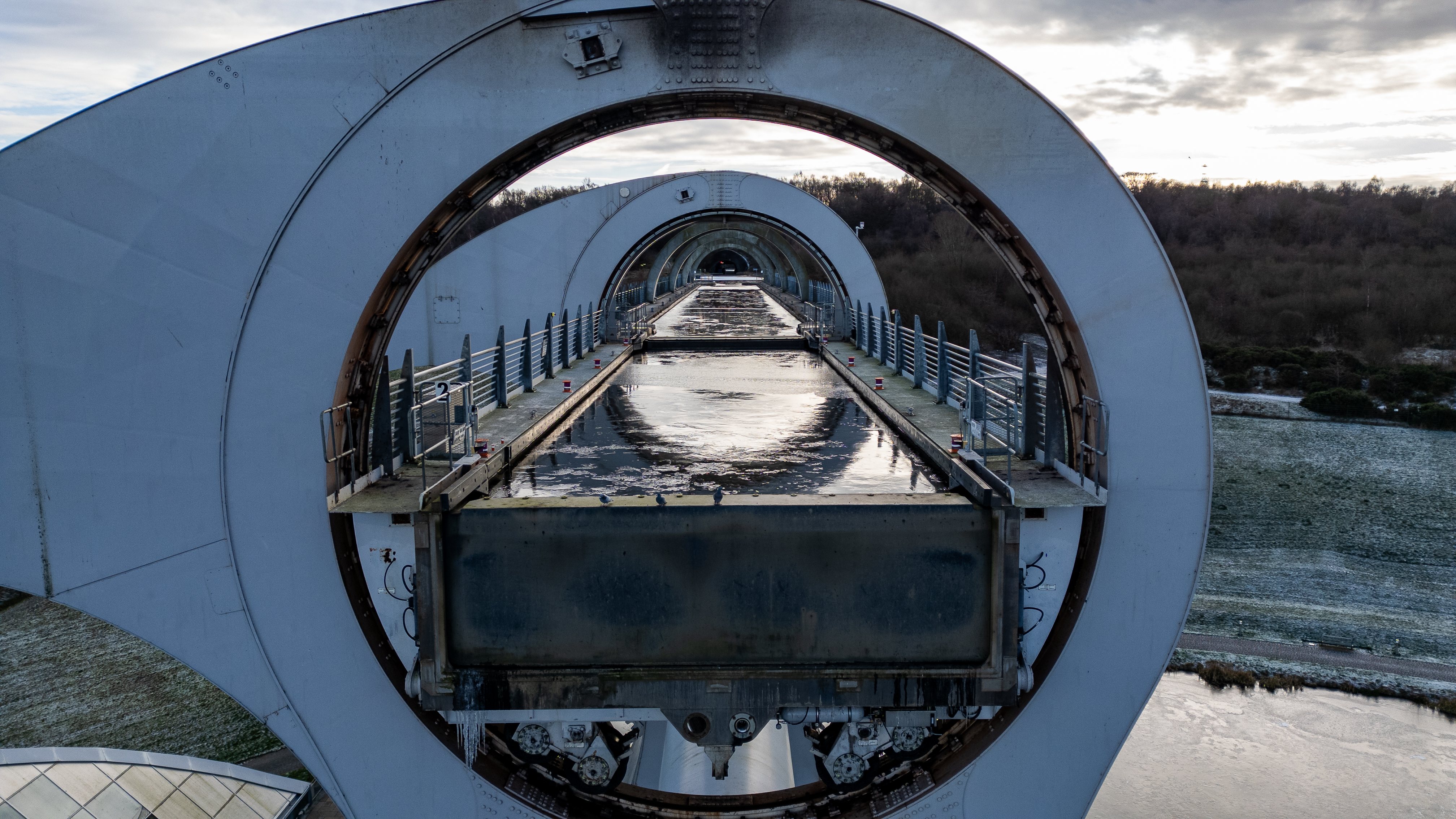 A massive, curved structure of a boat lift in cool tones, with a water trough at its center, framed by sky and trees.
