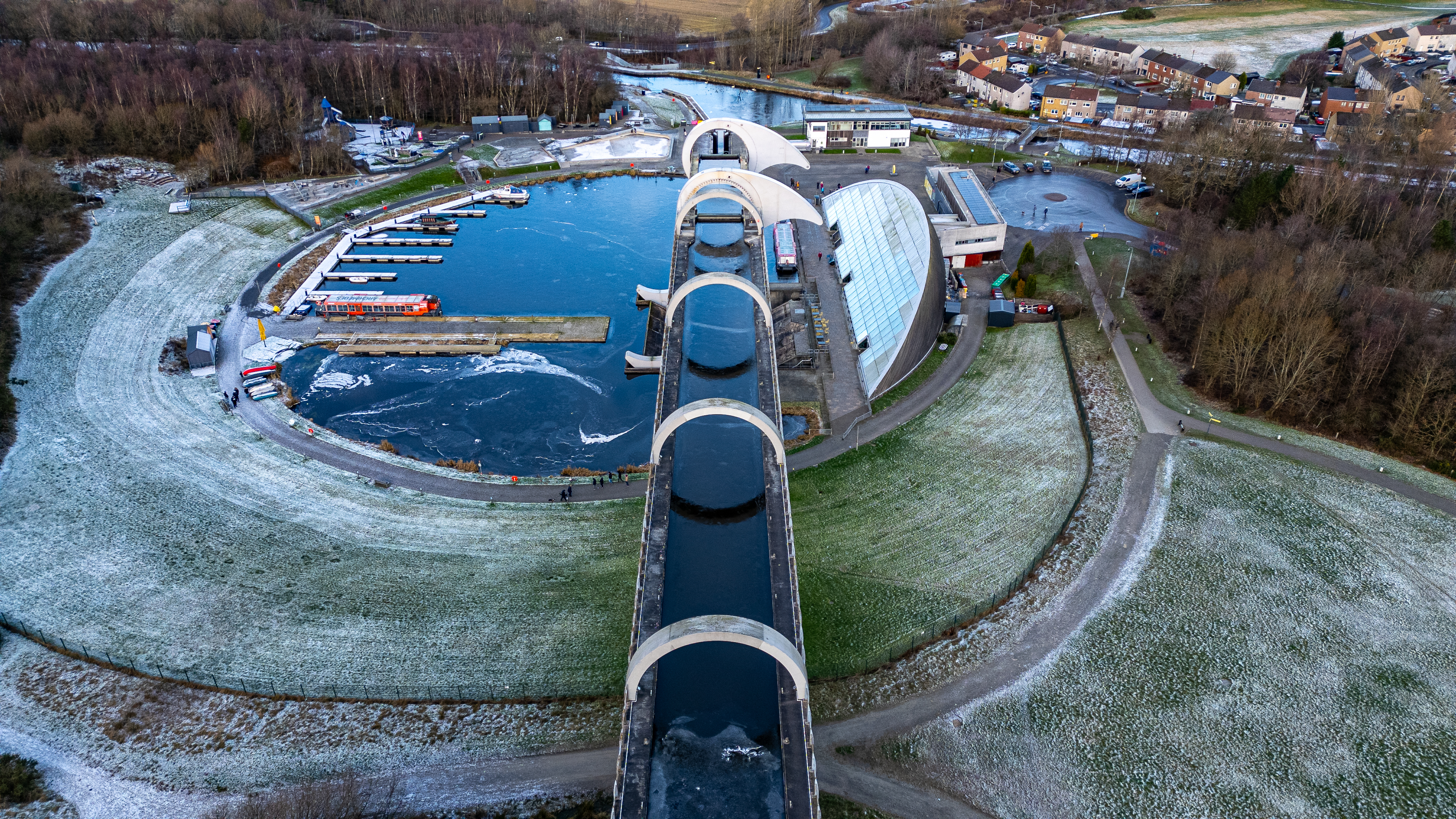 An aerial view of a canal boat lift with arcs over a water channel. A marina, buildings, and a village are visible in the background.
