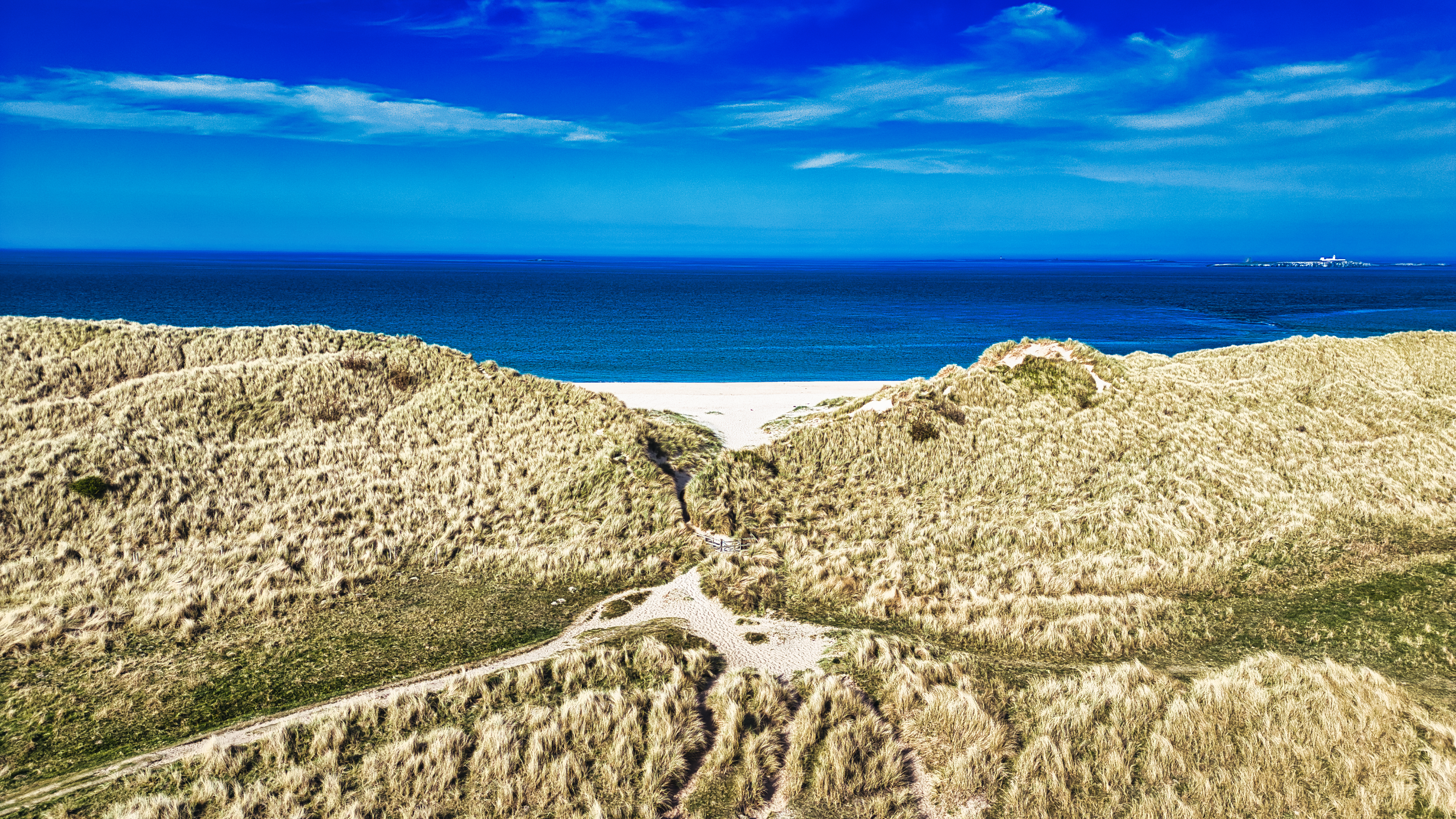 Overhead view of grassy dunes leading to a white sandy beach and deep blue ocean under a clear blue sky with scattered clouds at Bamburgh beach, UK.