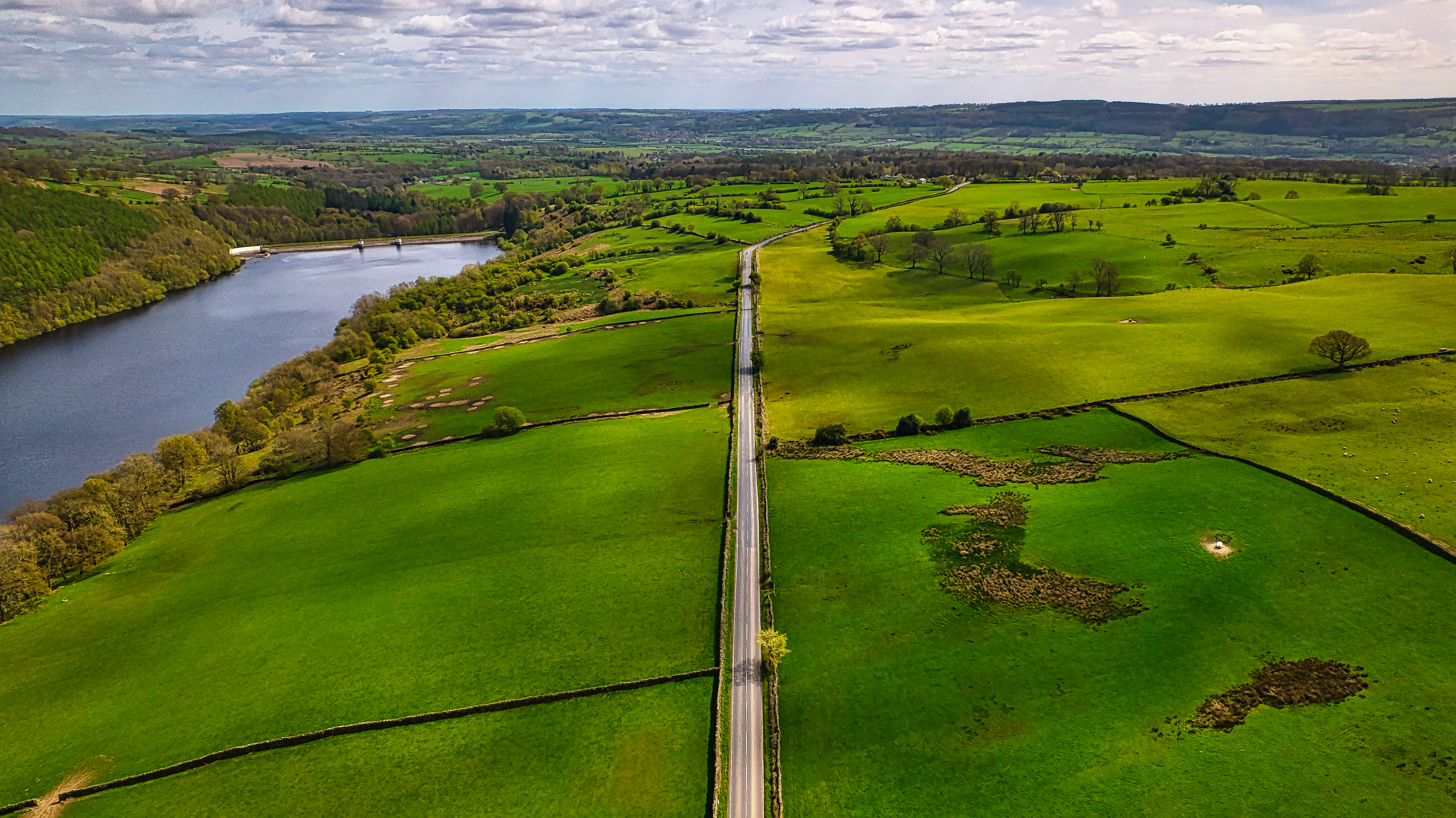 Aerial view of a lush green landscape with a road cutting through fields, alongside a river.