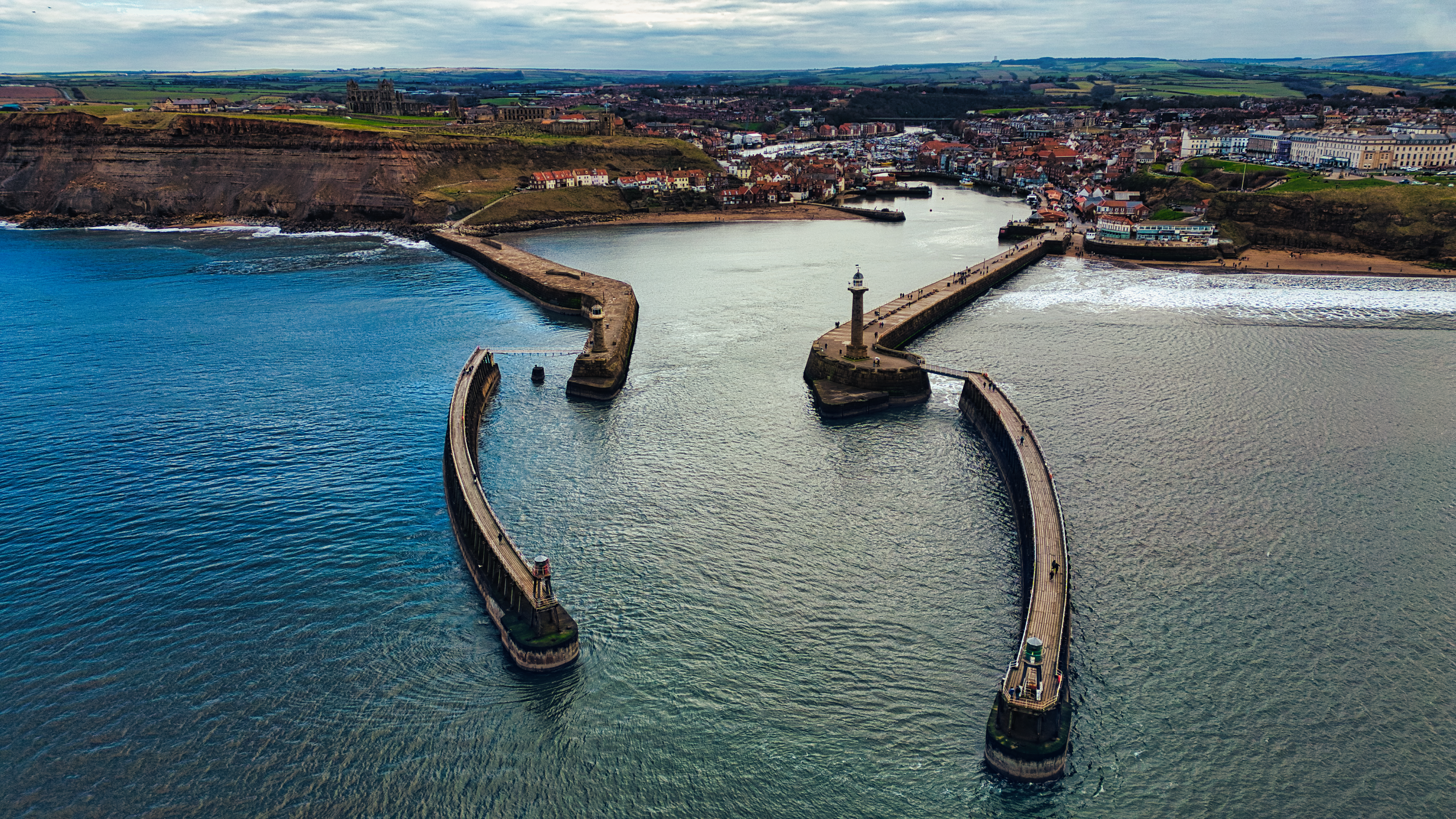 Aerial view of a harbor with two curved piers, a lighthouse, and a coastal town in the background under a cloudy sky in Whitby, UK.