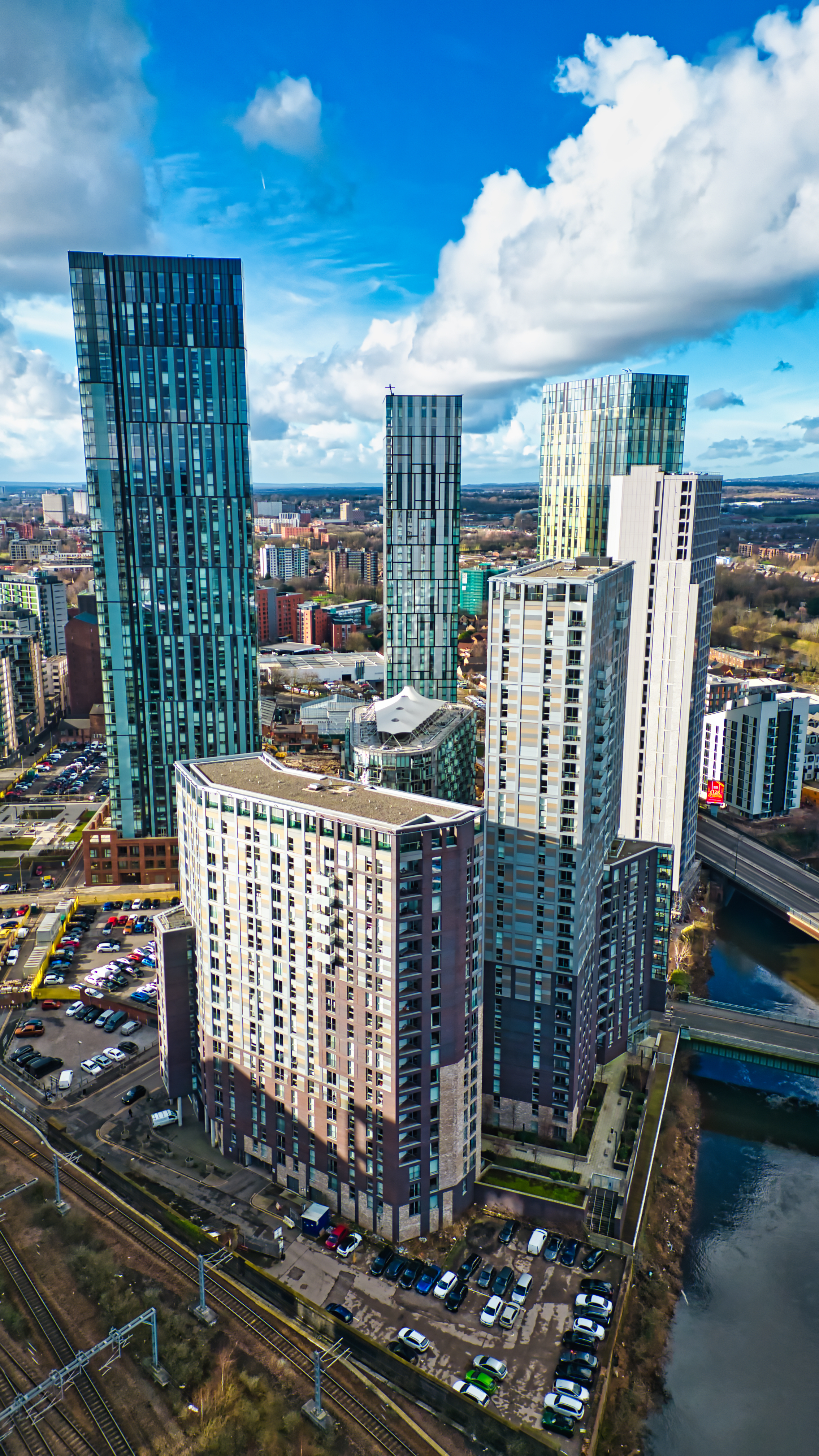Aerial view of several high-rise apartment buildings in a city, near a river and railway tracks. The buildings are primarily glass and concrete, varying in height and color. A partly cloudy sky is visible in Manchester, UK.
