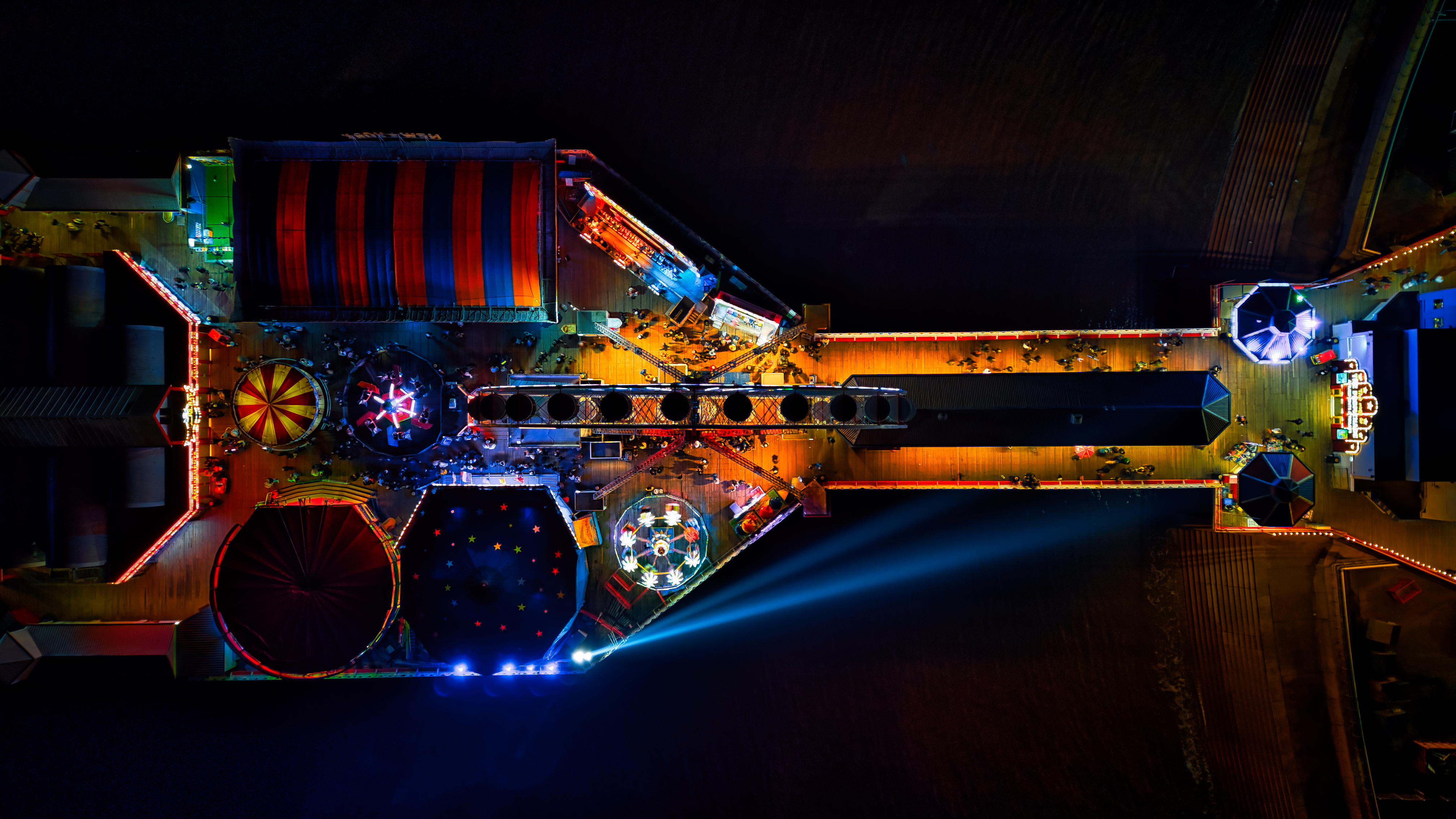 High-angle view of an illuminated open computer case showcasing colorful components and LED lights in Backpool, England.