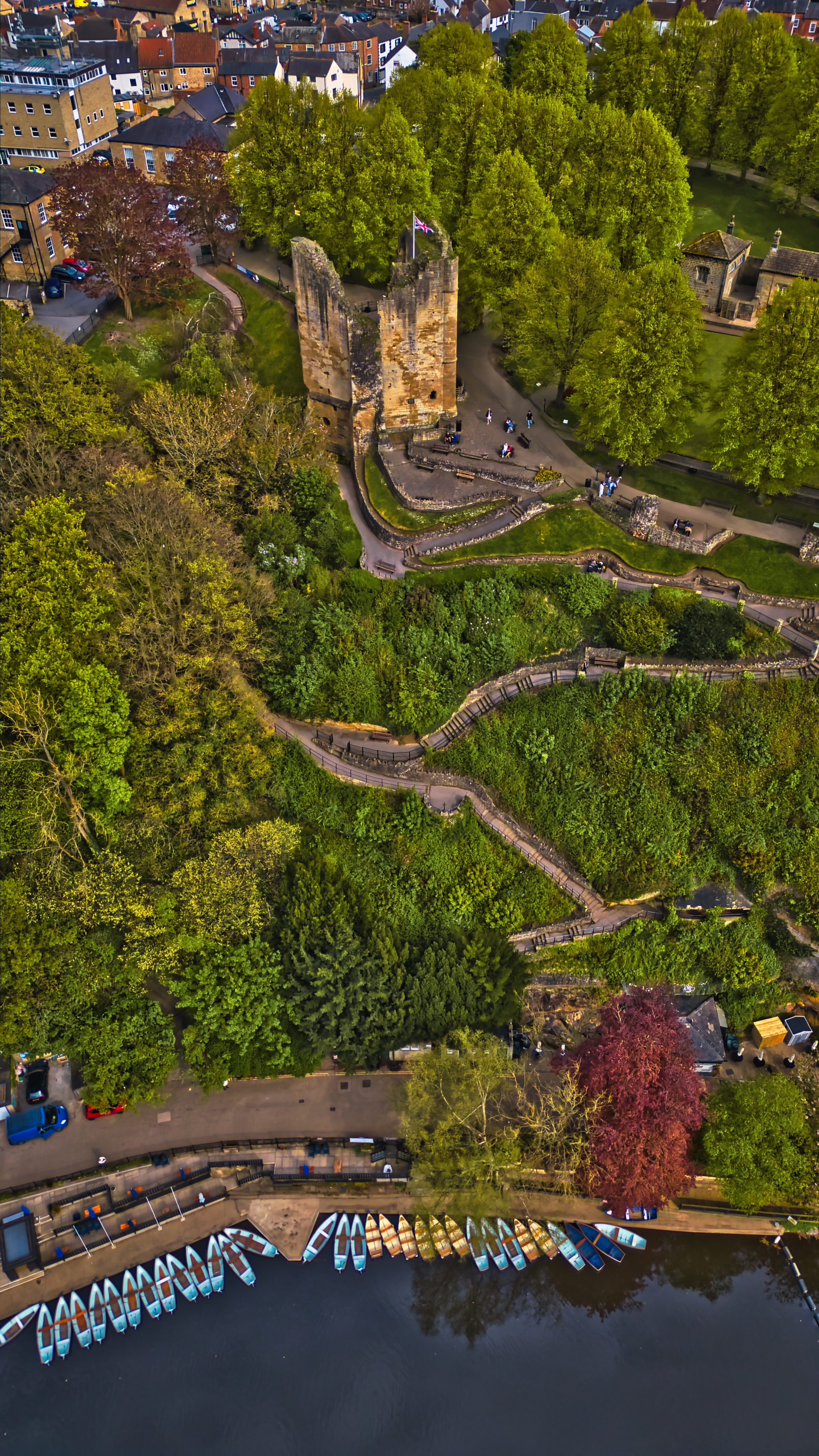 Aerial view of a historic tower surrounded by lush greenery and a river with aligned boats, in a quaint town setting.