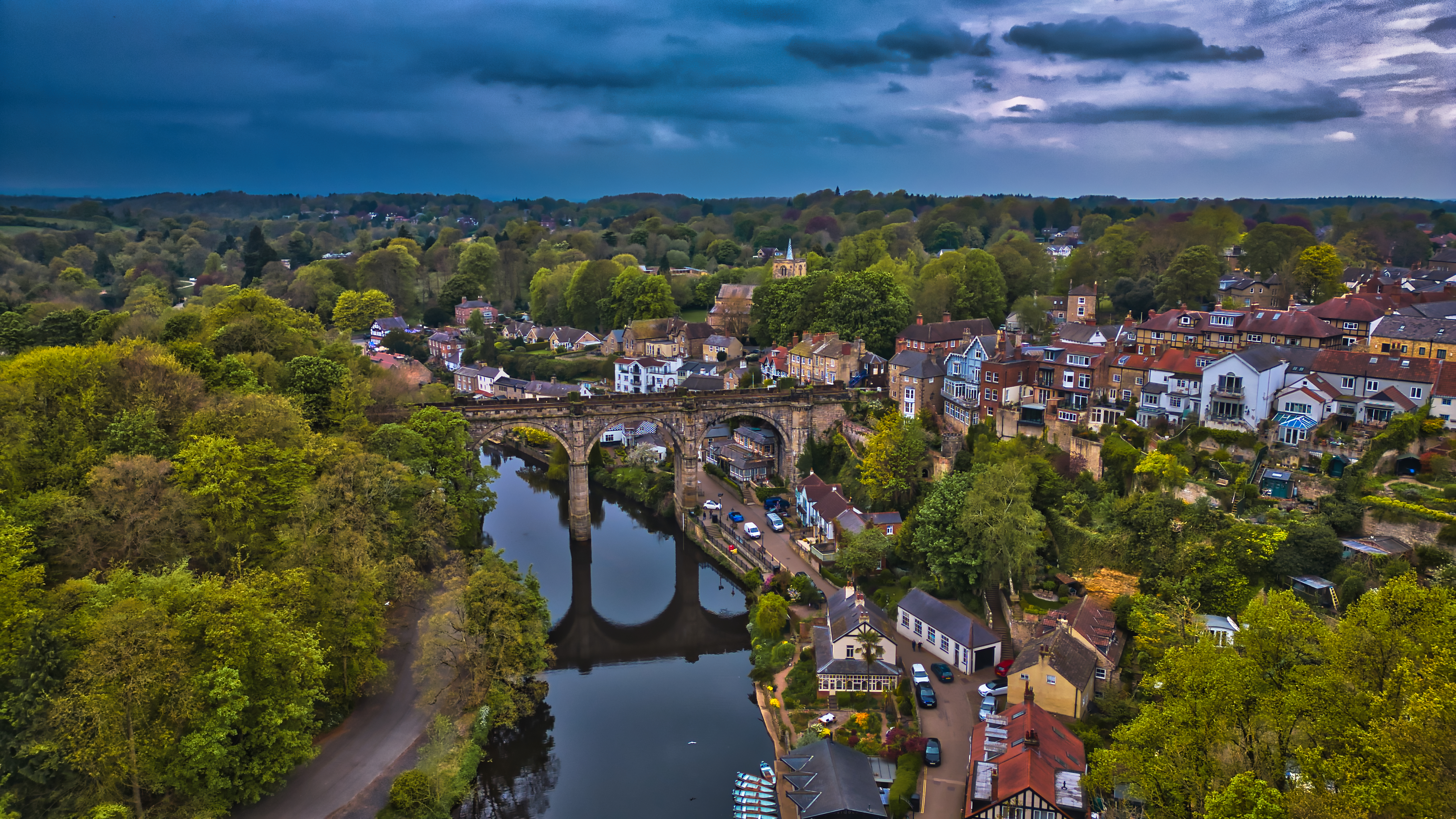 Aerial view of a quaint town with a historic stone bridge over a river, surrounded by lush greenery and residential buildings under a dramatic sky.