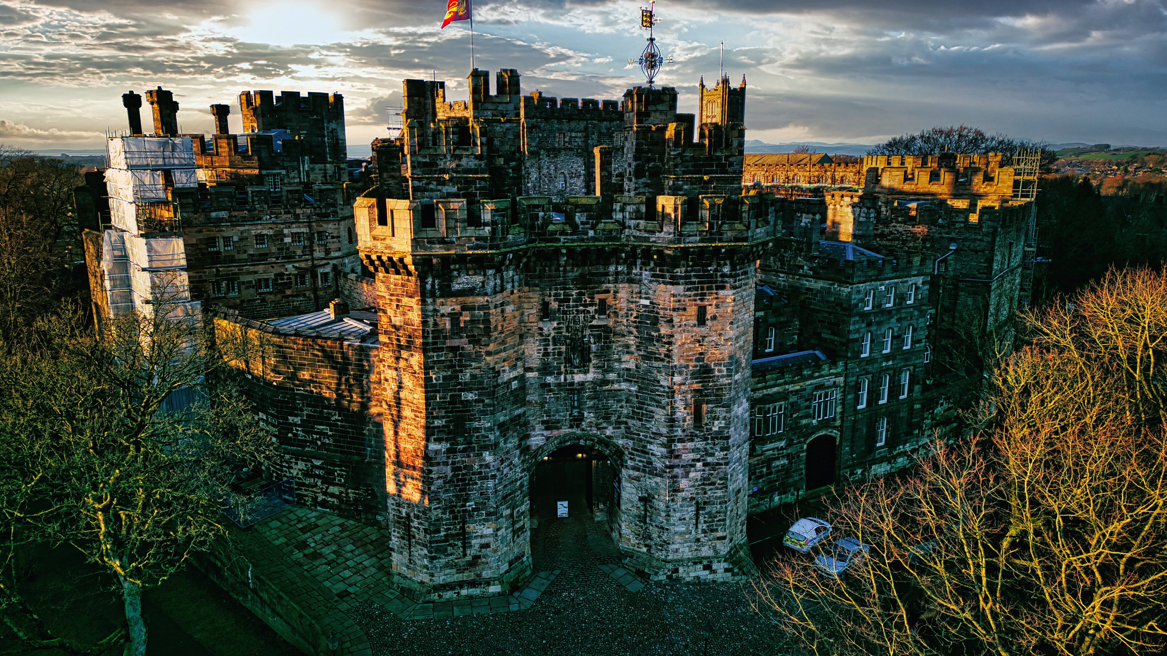 Historic medieval Lancaster castle at sunset with vibrant sky and lush greenery.