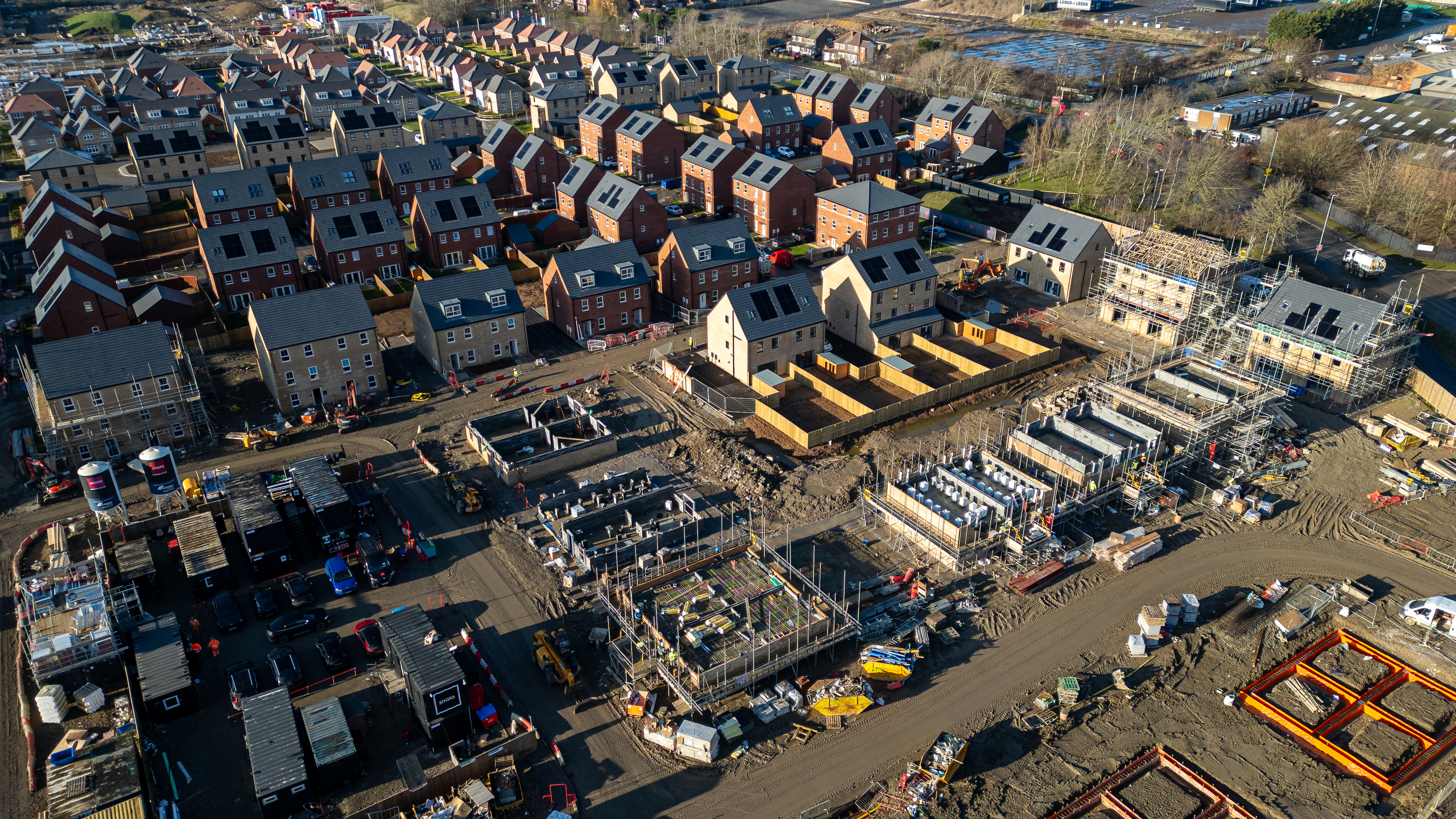 Aerial view of a housing development under construction, showing a mix of completed homes and ongoing building sites with machinery and materials at Desire by Strata Homes in Leeds, UK.