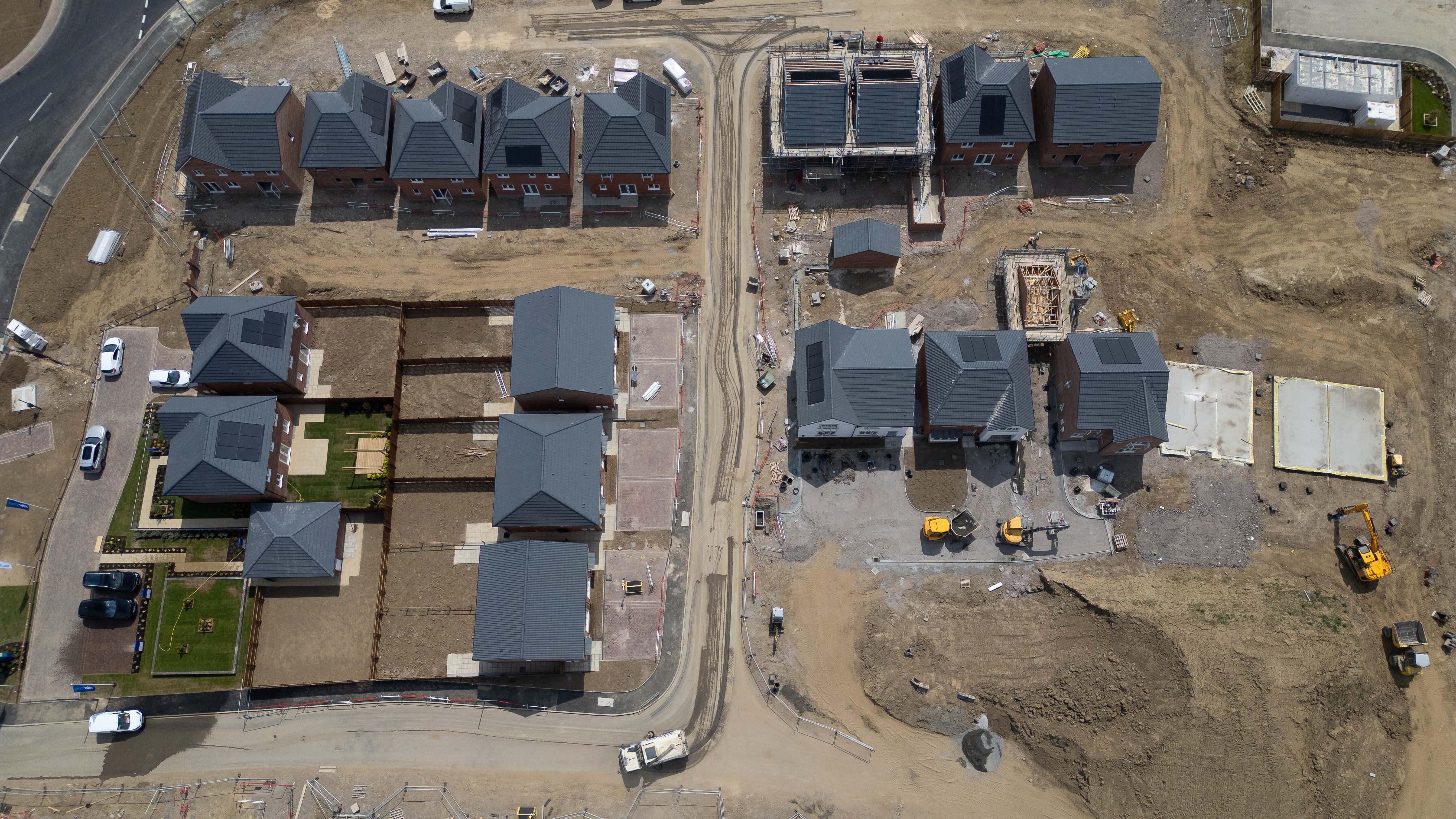 Aerial view of a housing development under construction, featuring completed homes, partially built structures, and heavy machinery on a dirt site at Miller Homes in Catterick, UK.