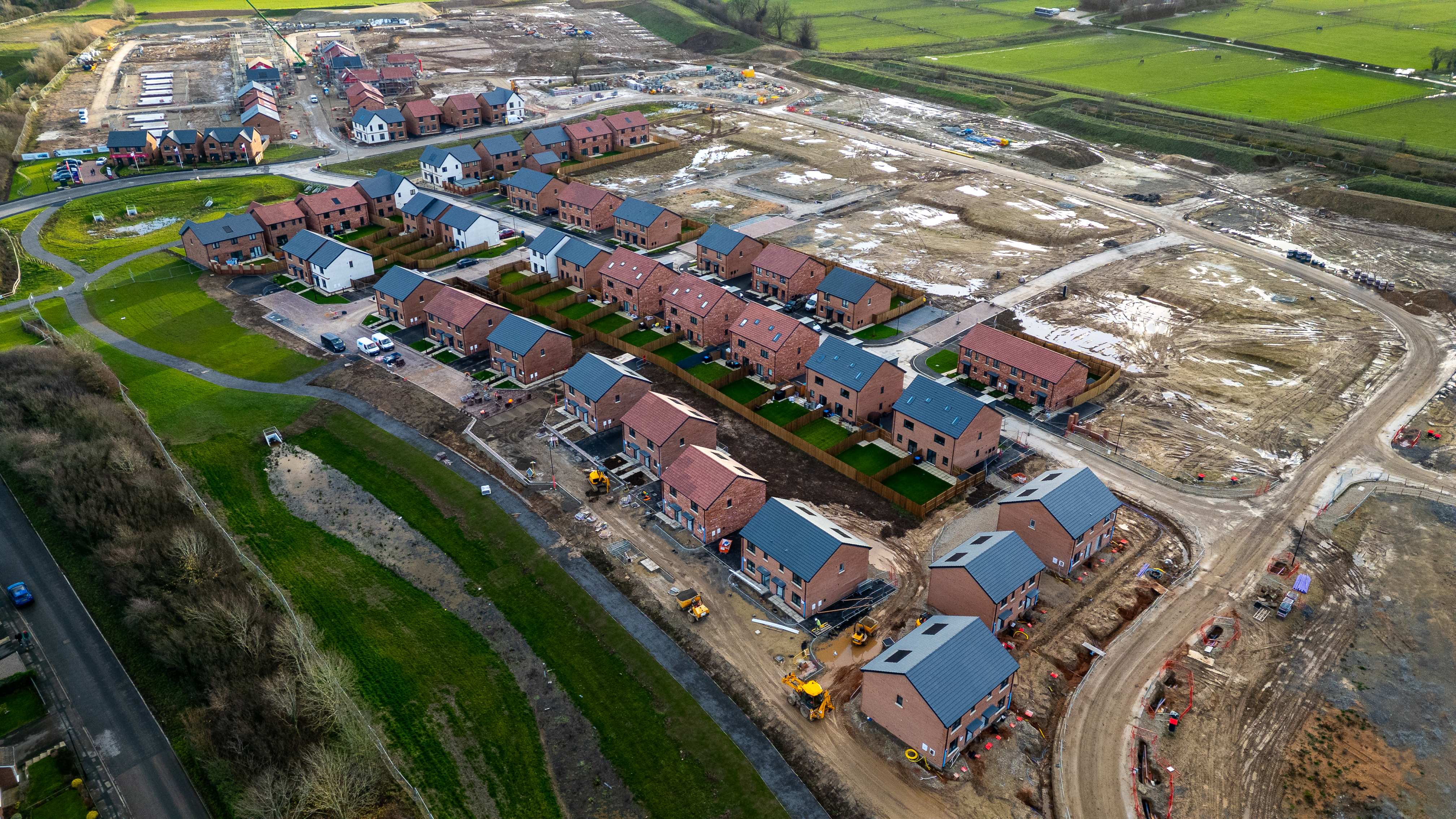 Aerial view of a housing development under construction, showing rows of brick houses with dark roofs, alongside muddy, undeveloped land and some green spaces at Taylor Wimpey, Ripon.