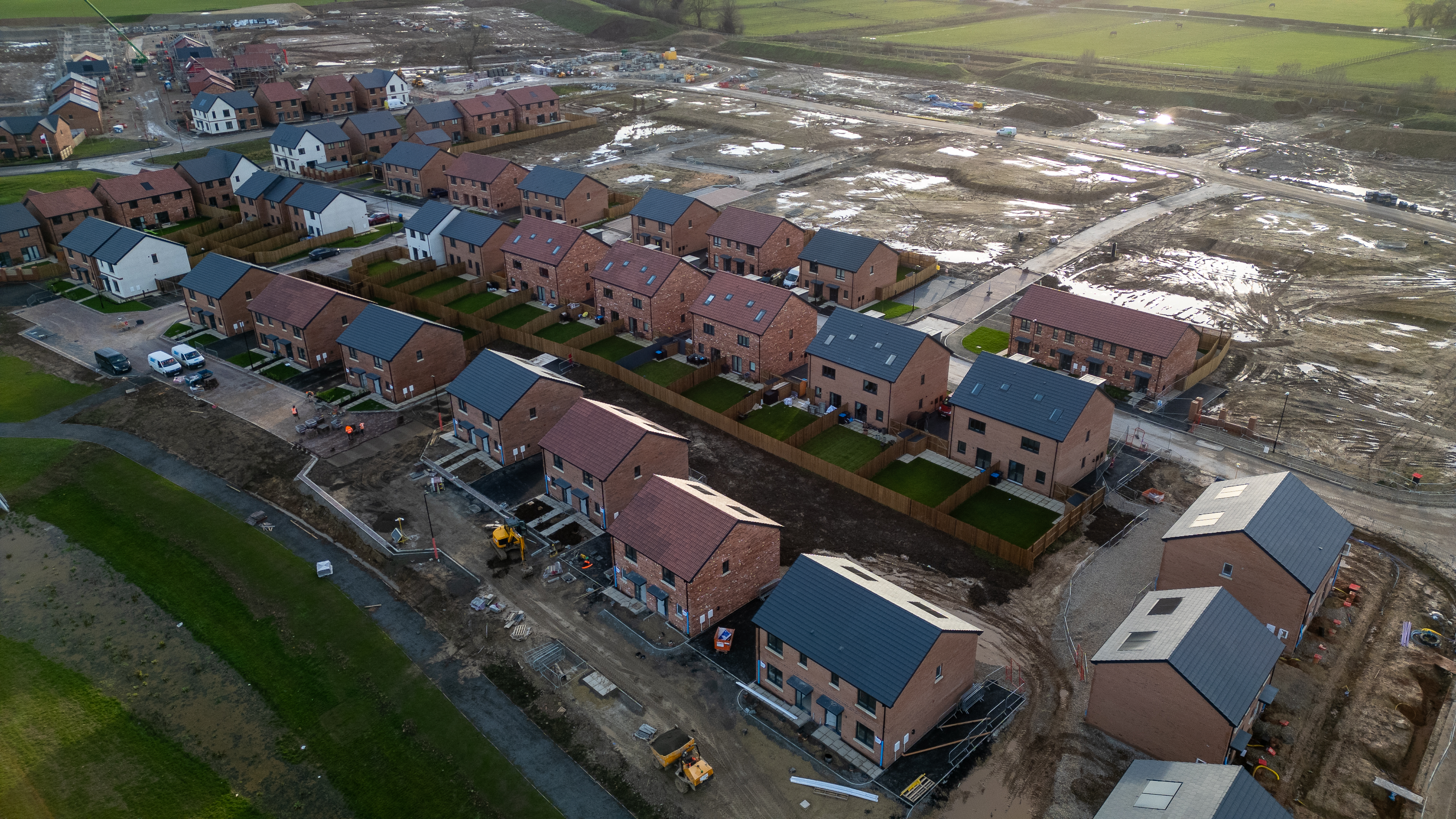 Aerial view of a housing development under construction, featuring brick houses with tiled roofs, muddy grounds, and construction vehicles at Taylor Wimpey, Ripon.