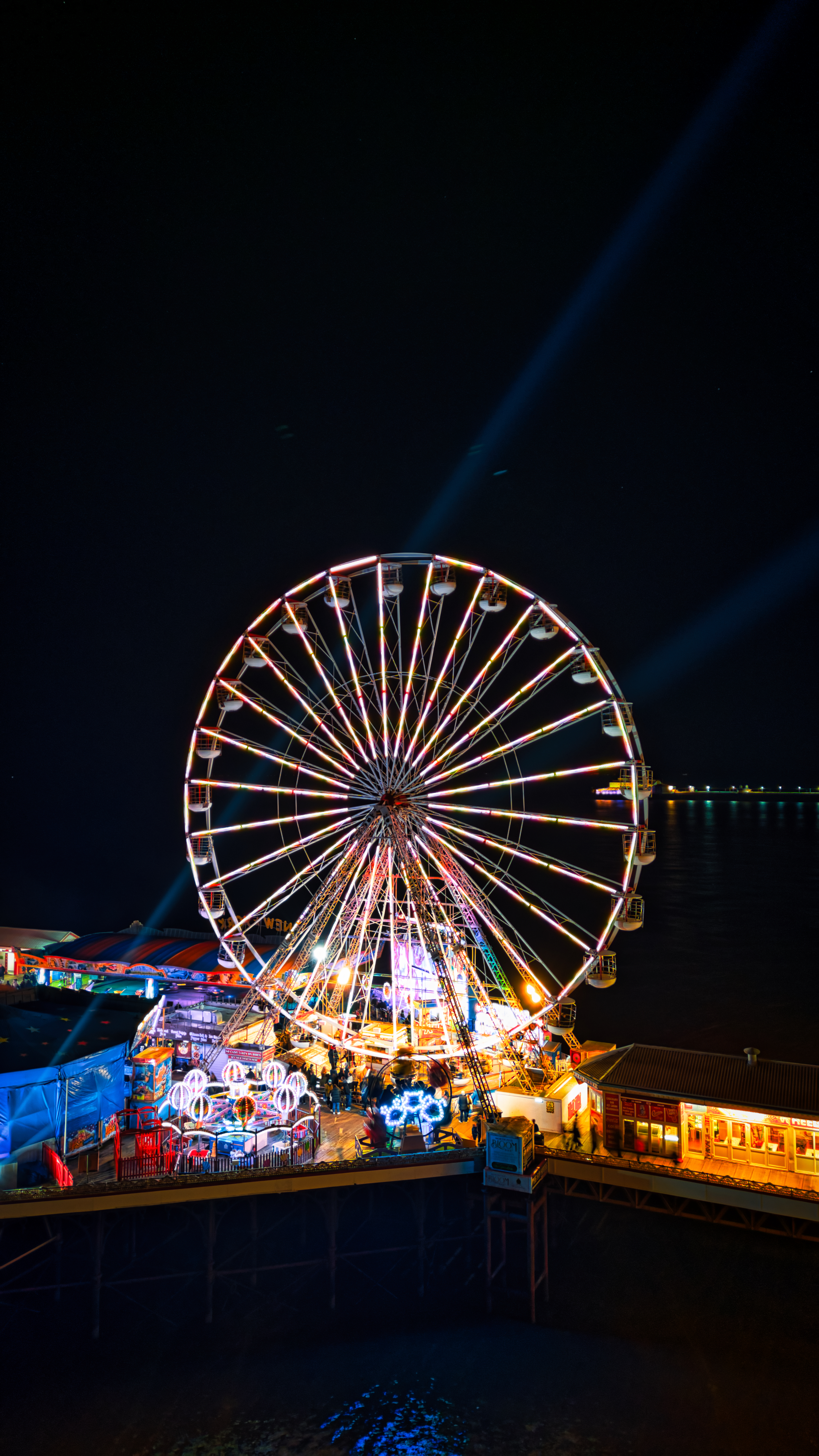 Illuminated Ferris wheel at night in an amusement park with vibrant colors and festive lights in Backpool, England.