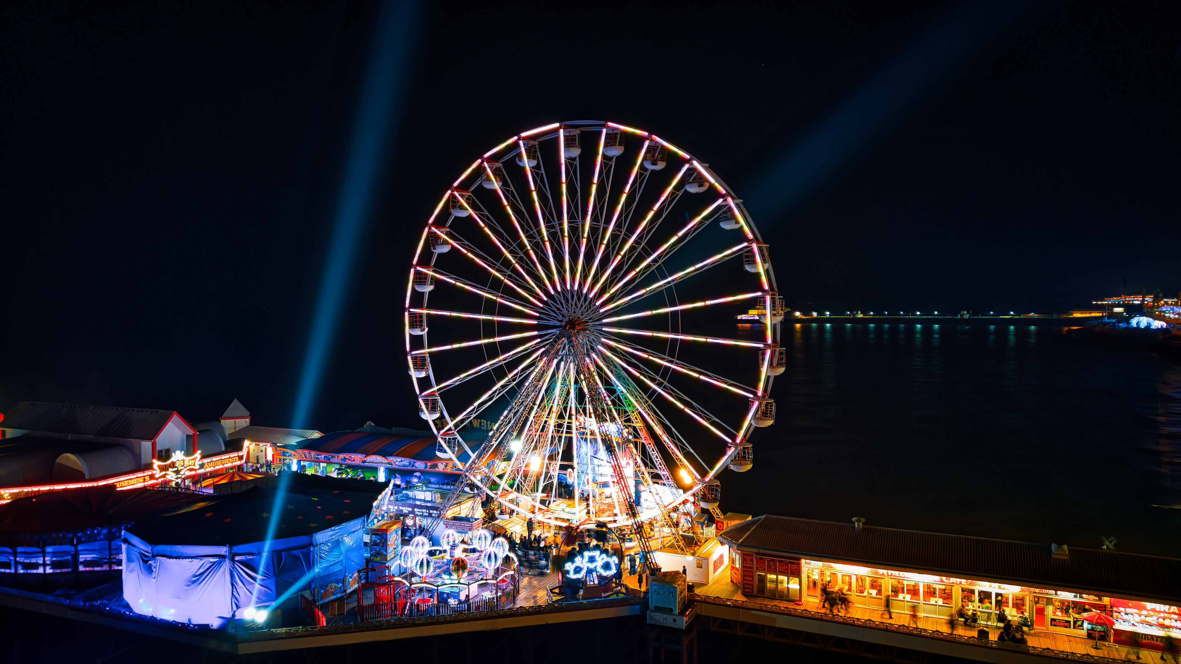 Illuminated Ferris wheel at night with vibrant lights and festive atmosphere at a seaside amusement park in Backpool, England.