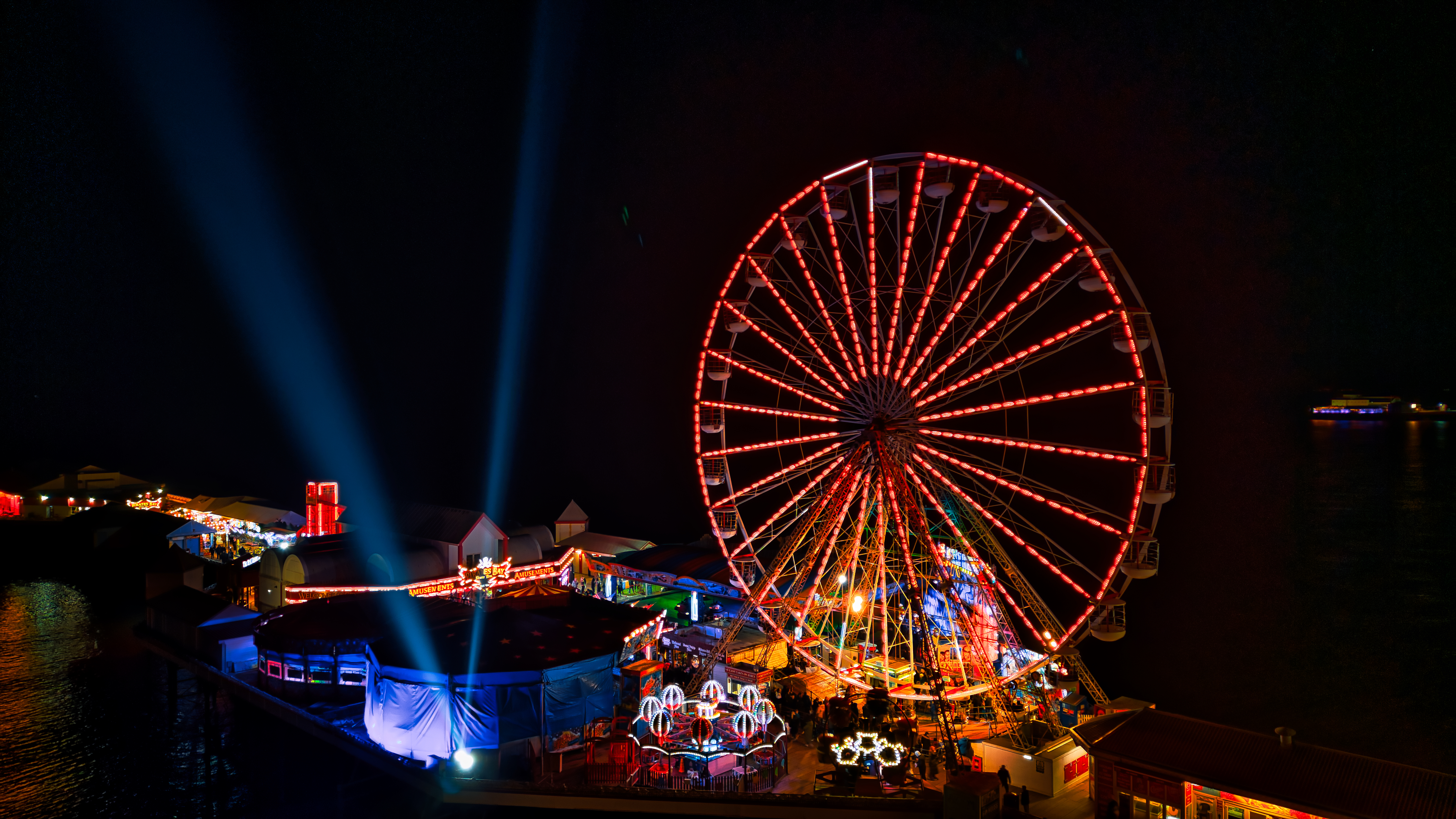 Illuminated ferris wheel at night with vibrant lights and beams against a dark sky.