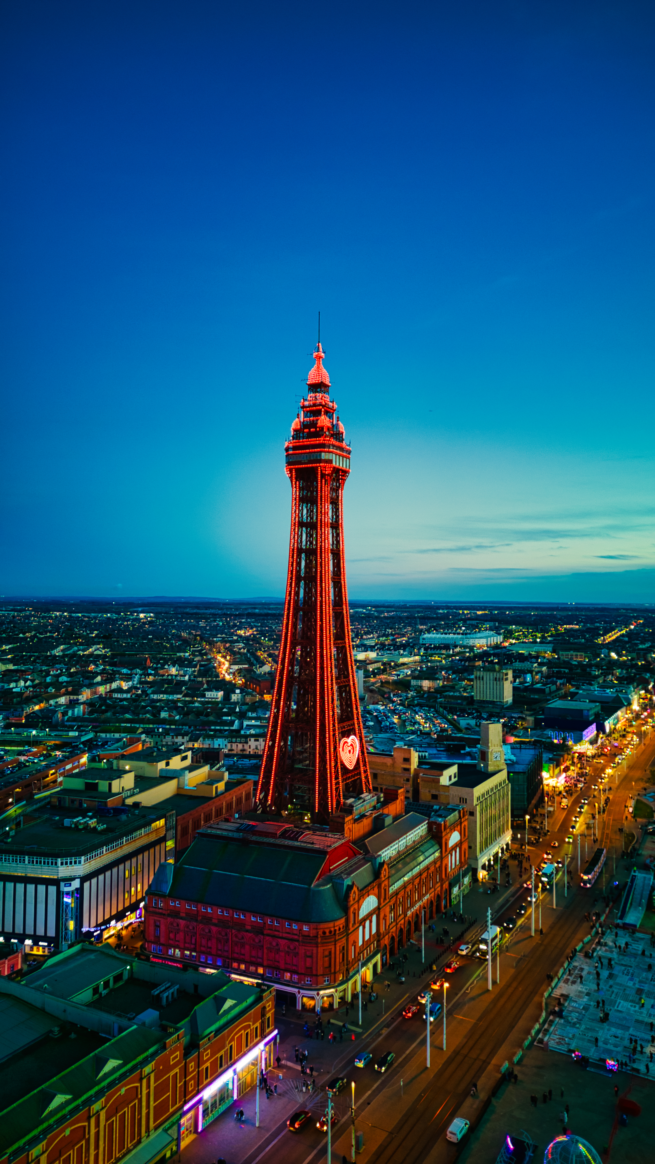 Illuminated tower at twilight with cityscape and coastline in Backpool, England.