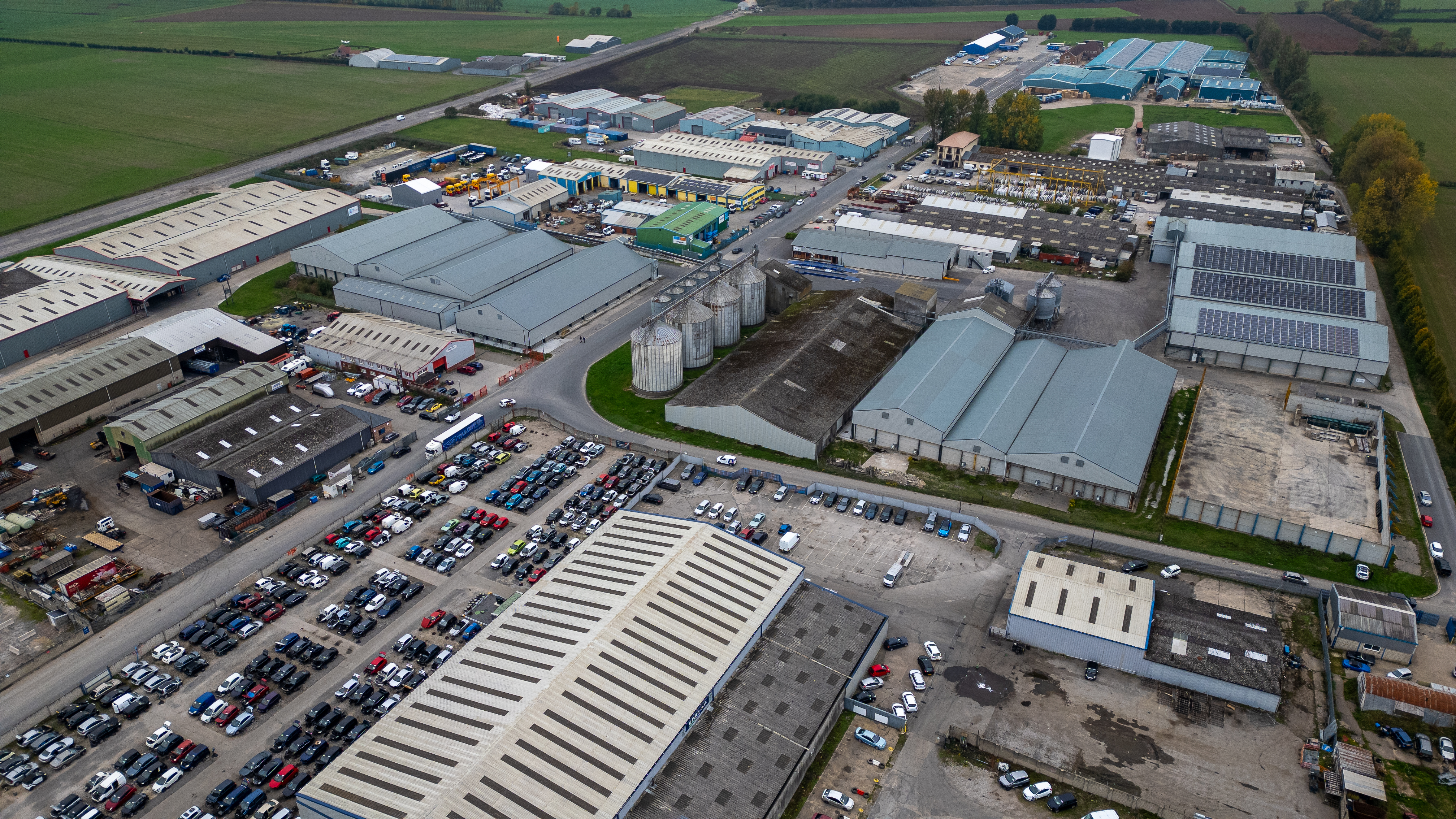 Aerial view of an industrial estate with numerous warehouses, a large car park, agricultural fields, and a road at U-Pull-It York, UK.