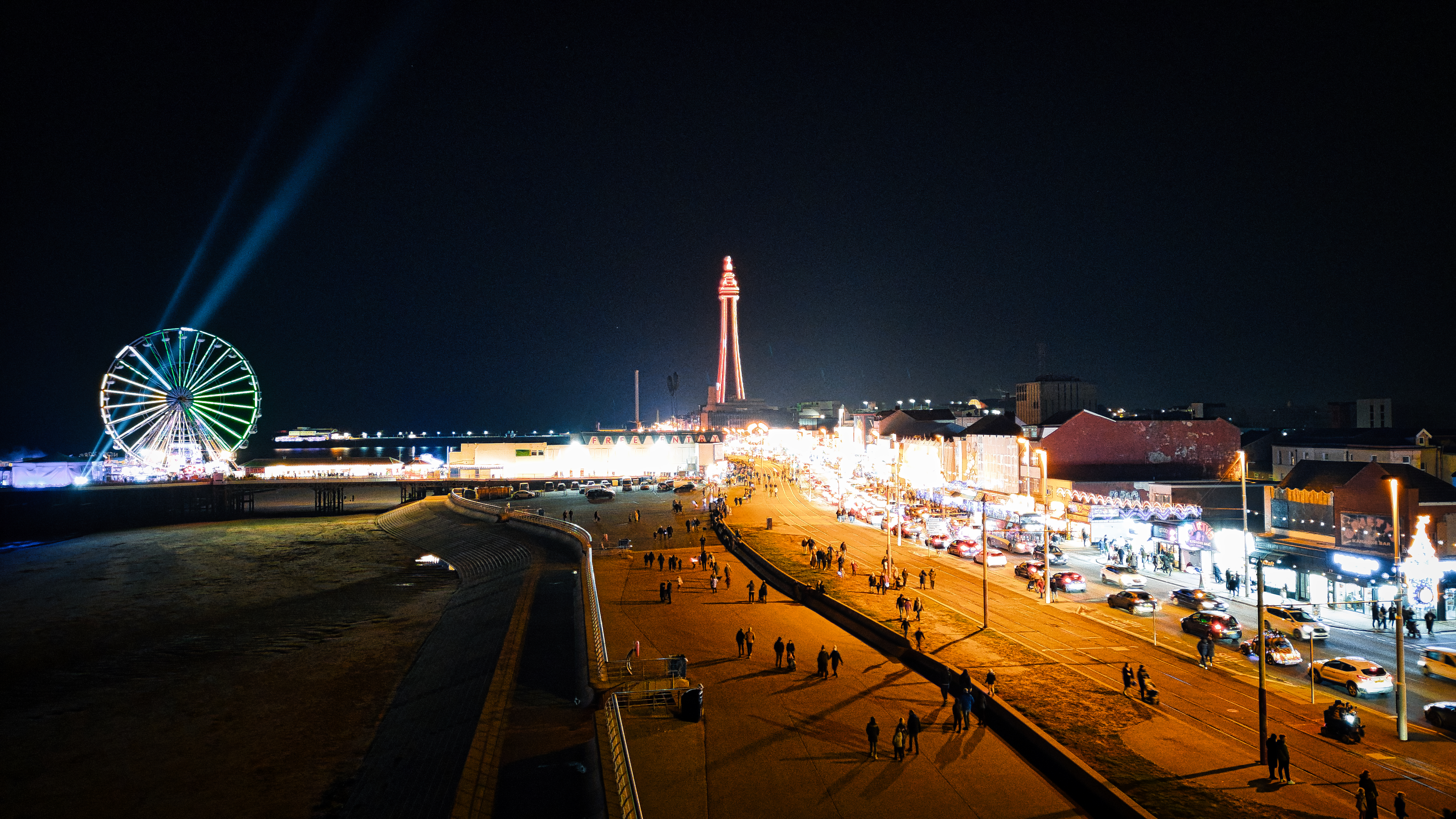 Lively boardwalk at night with illuminated Ferris wheel and tower, bustling street, and vibrant city lights in Backpool, England.