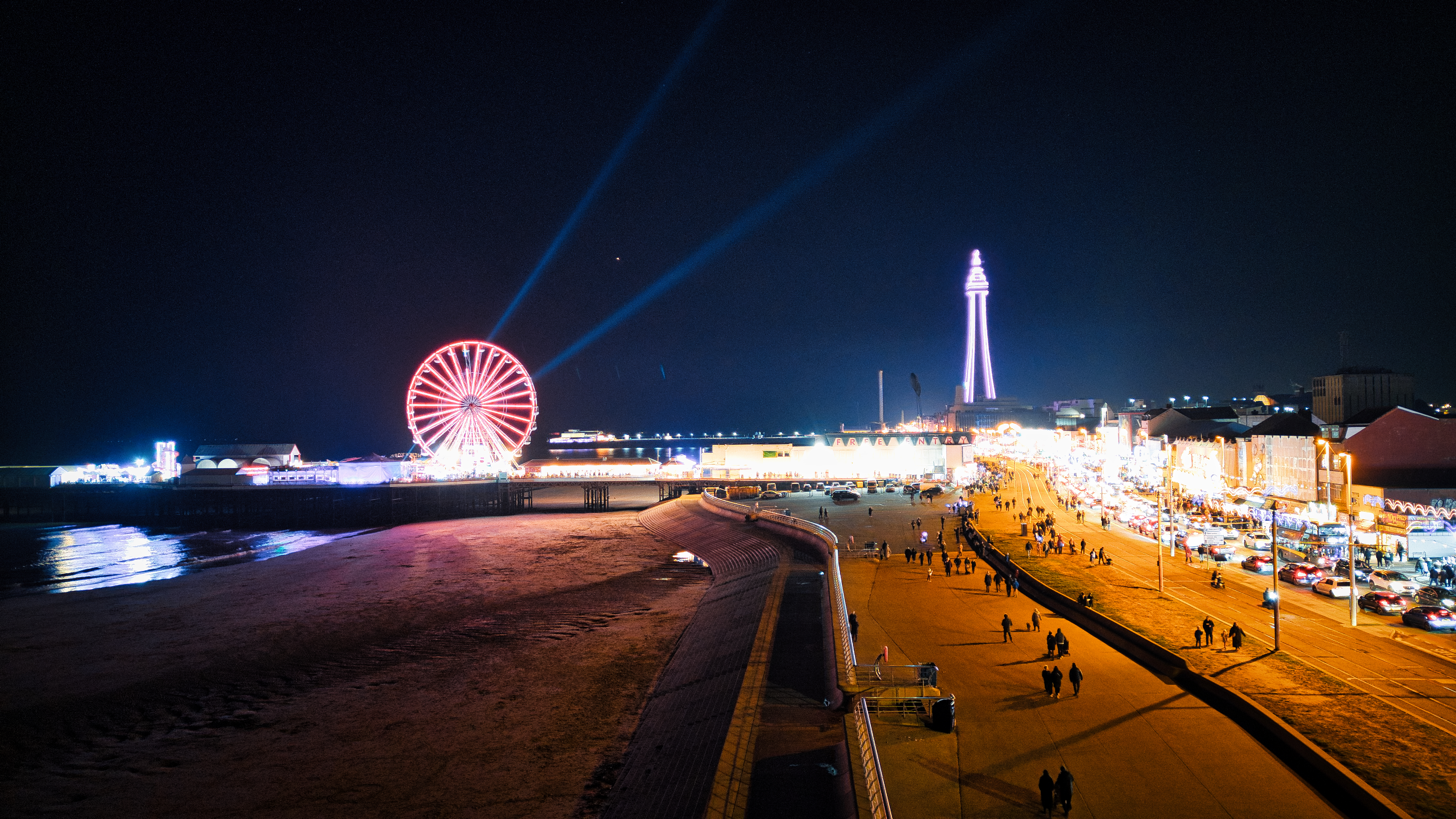 Lively boardwalk at night with illuminated Ferris wheel and tower, bustling with activity and beachside attractions in Backpool, England.