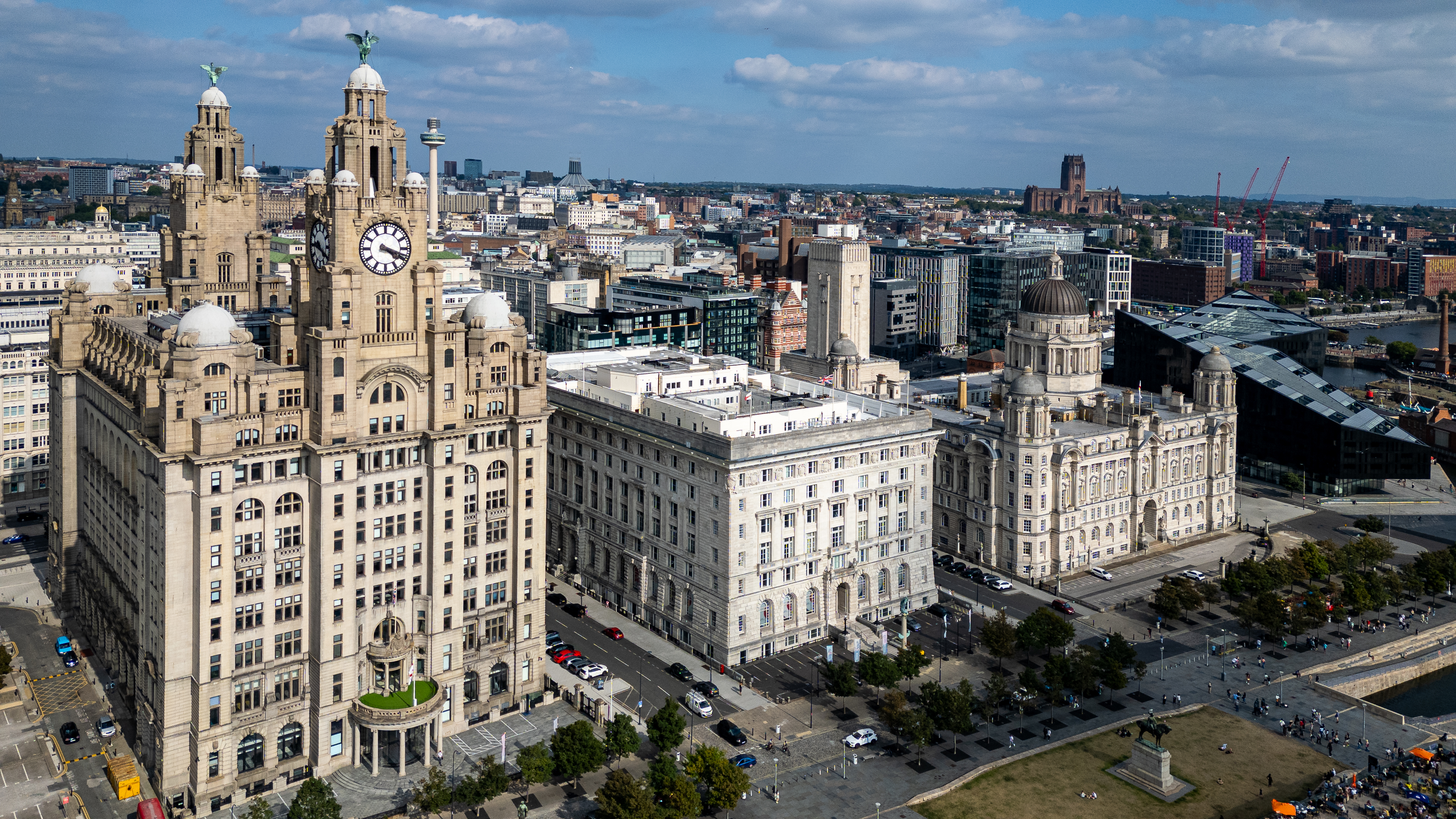 An aerial view of Liverpool's waterfront, showcasing historic and modern architecture under a cloudy blue sky.