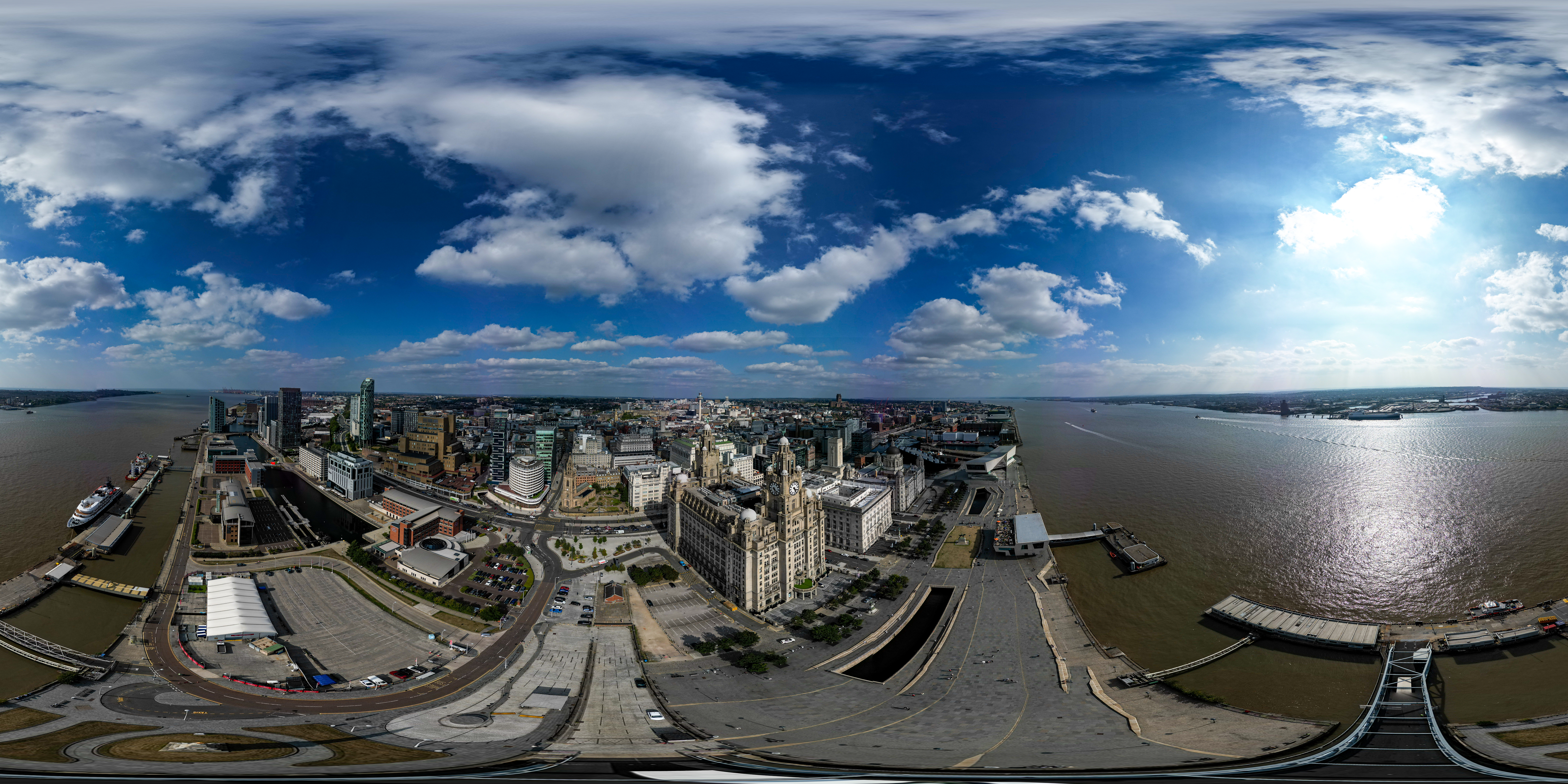 Panoramic view of a city skyline and waterfront under a blue sky with white clouds in Liverpool, UK.
