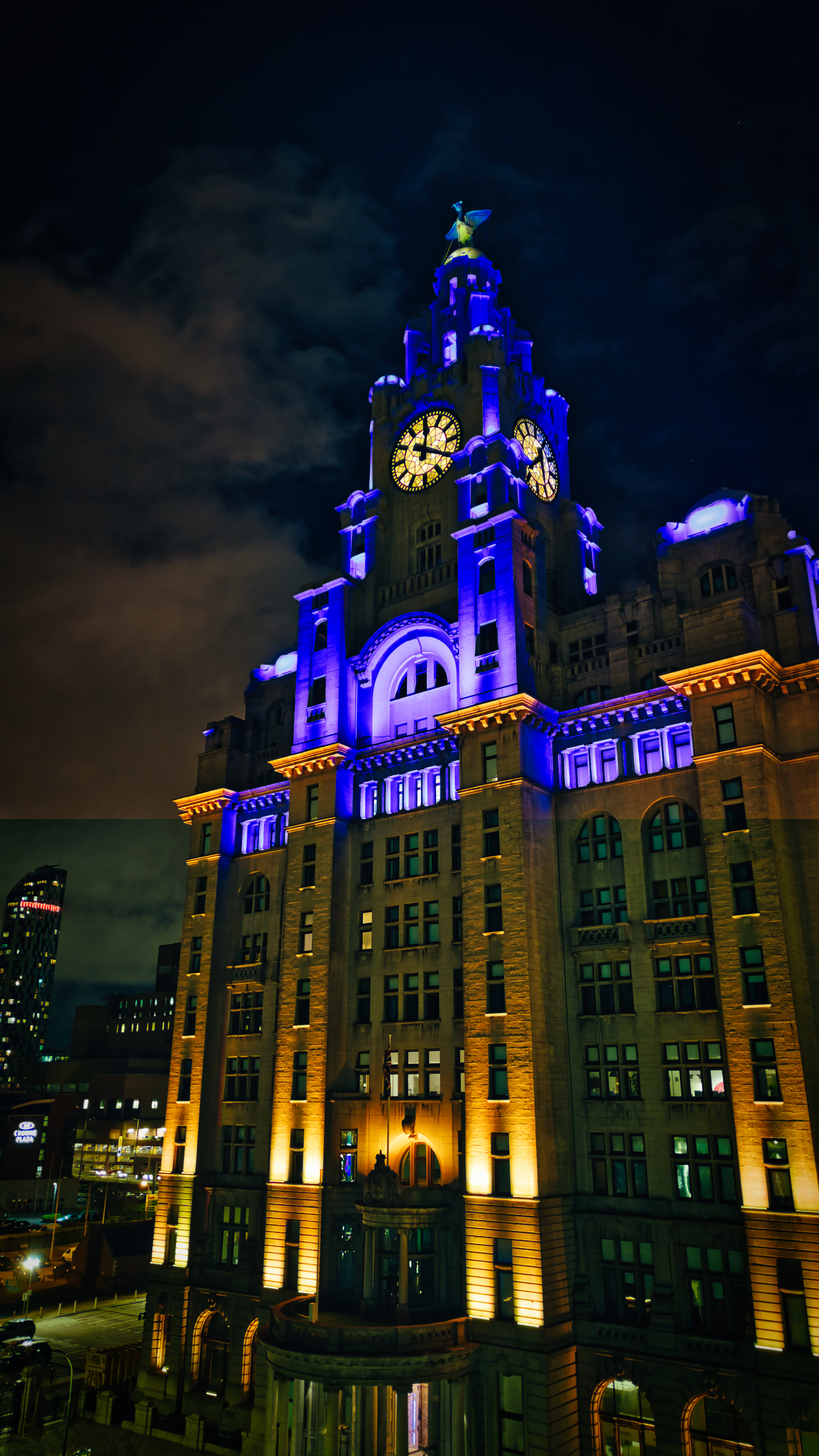 Liverpool's iconic Royal Liver Building at night, illuminated with blue lights against a dark sky.